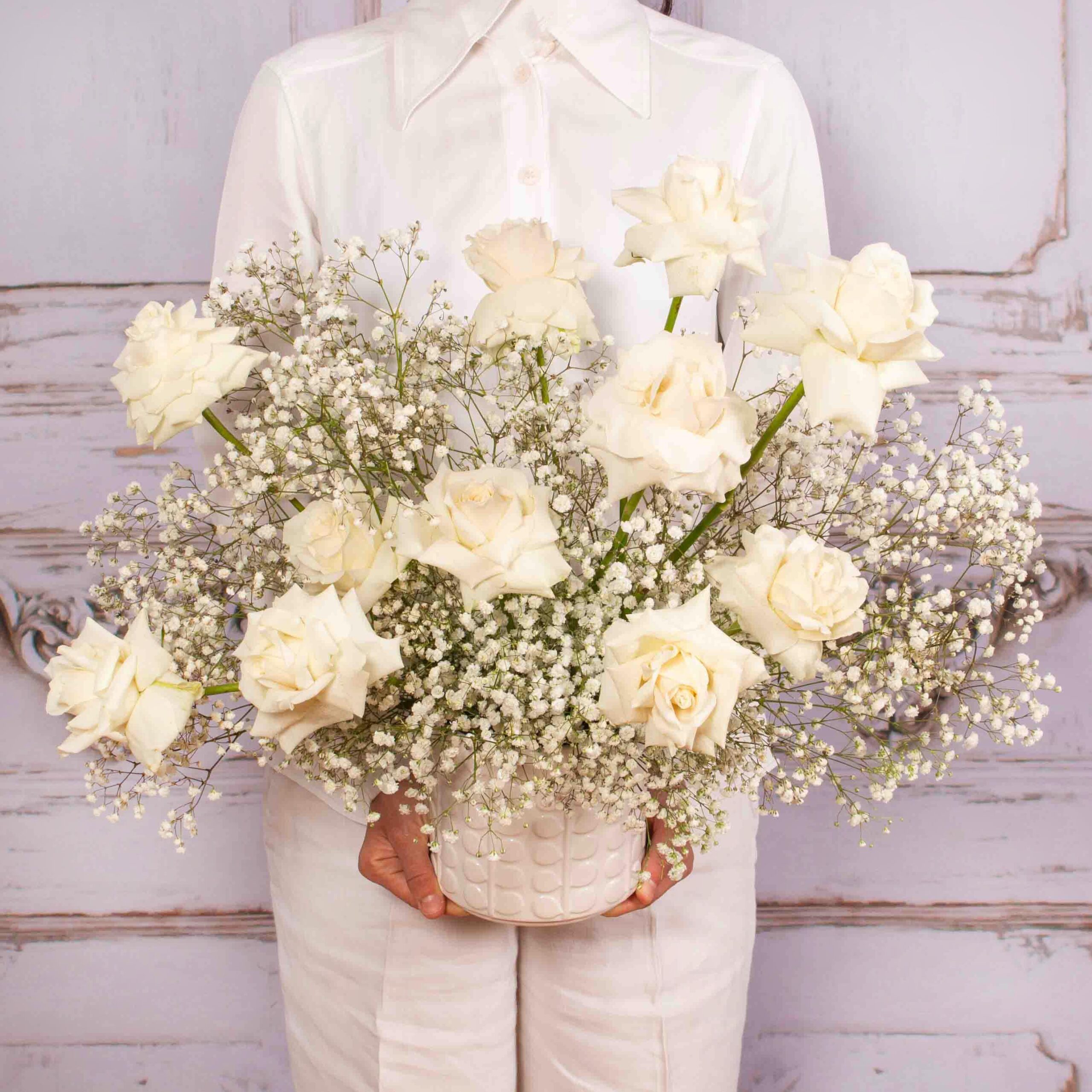 Aranjament in vaza ceramica cu 11 trandafiri albi si 12 gypsophilla.