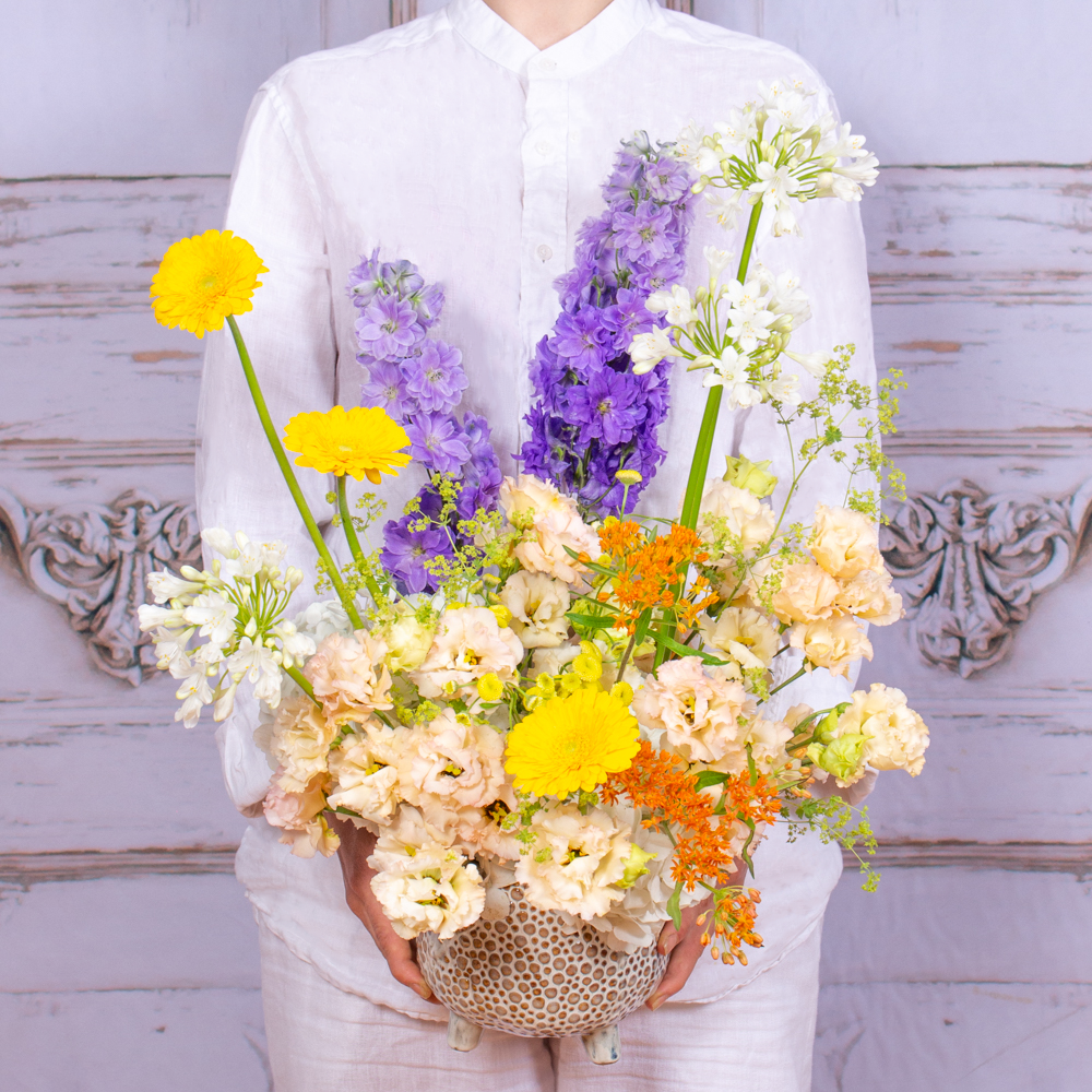 Iubim emotiile si bucuria pe care le vedem pe chipul celor care primesc flori si aranjamente florale pregatite in floraria Purple Flowers. De aceea ne straduim de fiecare data sa cream aranjamente unice care sa surprinda prin forma si culoare. Acest aranjament cu delphinium albastru, germini galben, garoafe peach si alte flori este cadoul de care ai nevoie atunci cand vrei sa spui „Te iubesc!” unei persoane dragi.