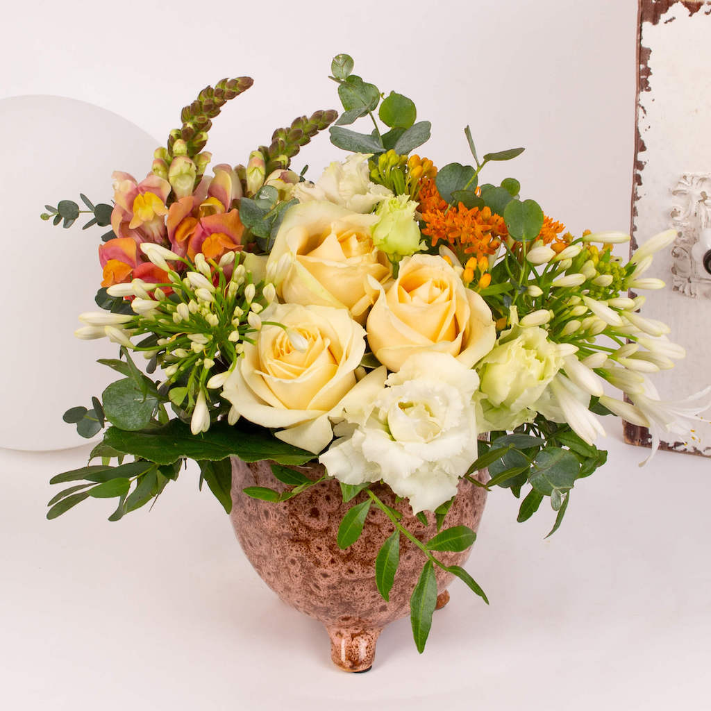 Aranjament cu vas ceramic,2 antirrhinum, lisianthus, 3 trandafiri, verdeata si alte flori de decor.