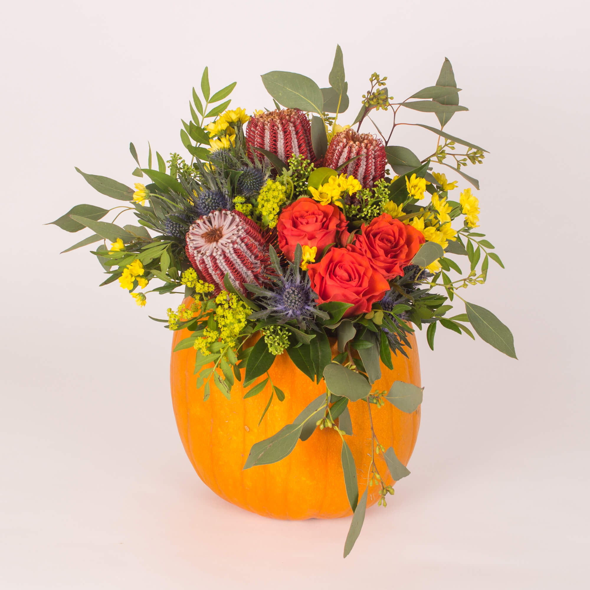 Aranjament cu 3 trandafiri portocalii, crizantema, bostan, verdeata si alte flori de decori.
