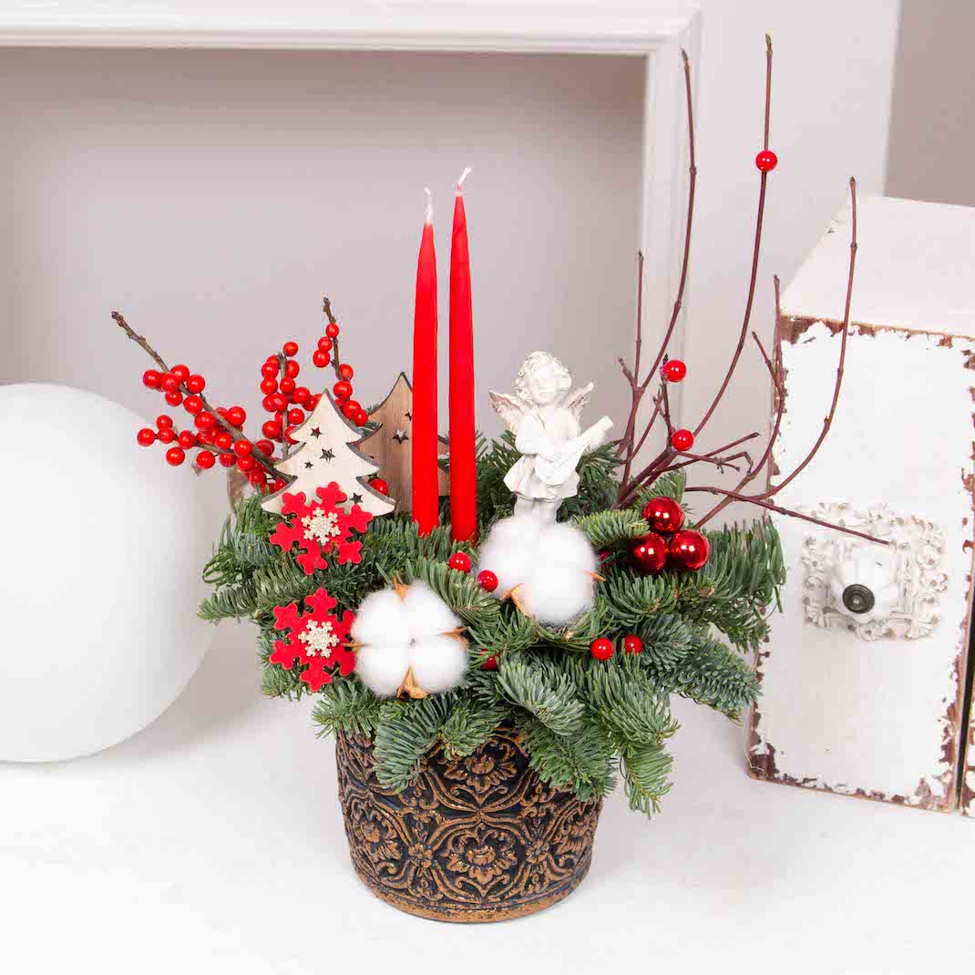 Aranjament in vas cu 2 cupe de bumbac, 3 globuri mici rosii, 2 luamanri, figurina inger, verdeata si alte elemente de decor.