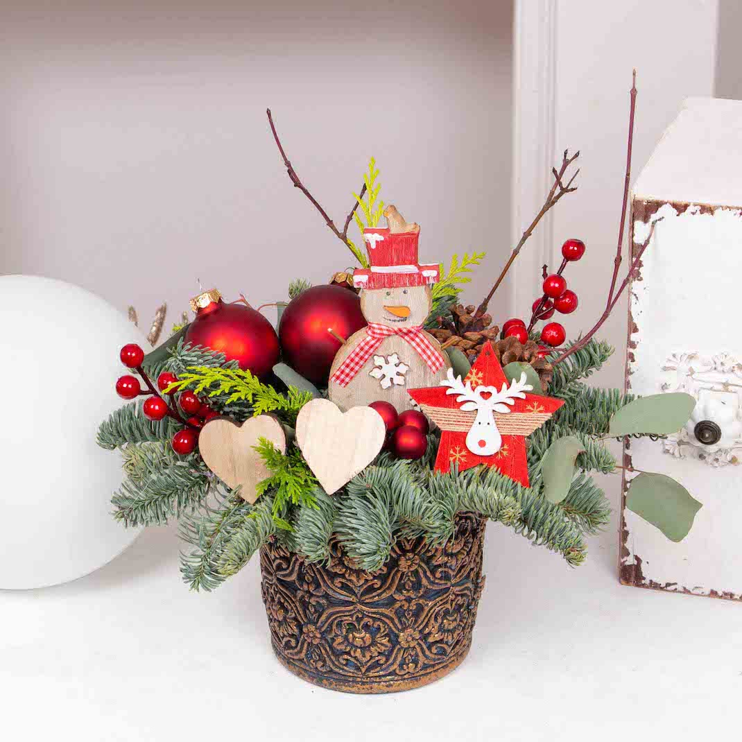 Aranjament in vas ceramic cu 2 globuri mari rosii, 3 globuri mici rosii, figurina om de zapada, figurina mica stea rosie, verdeata si alte elemente de decor.