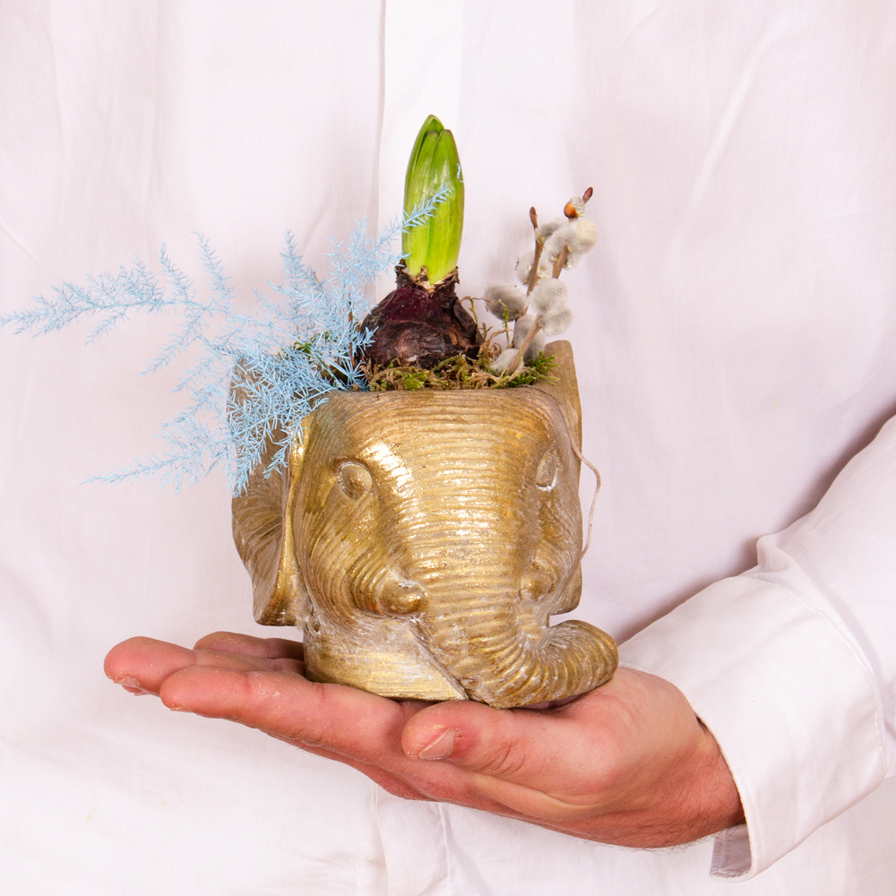 Aranjament in vas ceramic cu 1 bulb de zambila, asparagus, salix wilow, muschi verde.