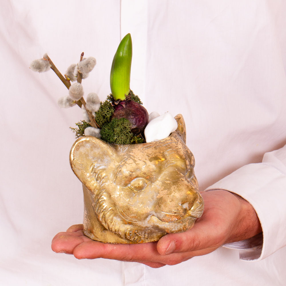 Aranjament in vas ceramic cu 1 bulb de zambila, salix wilow, muschi verde.