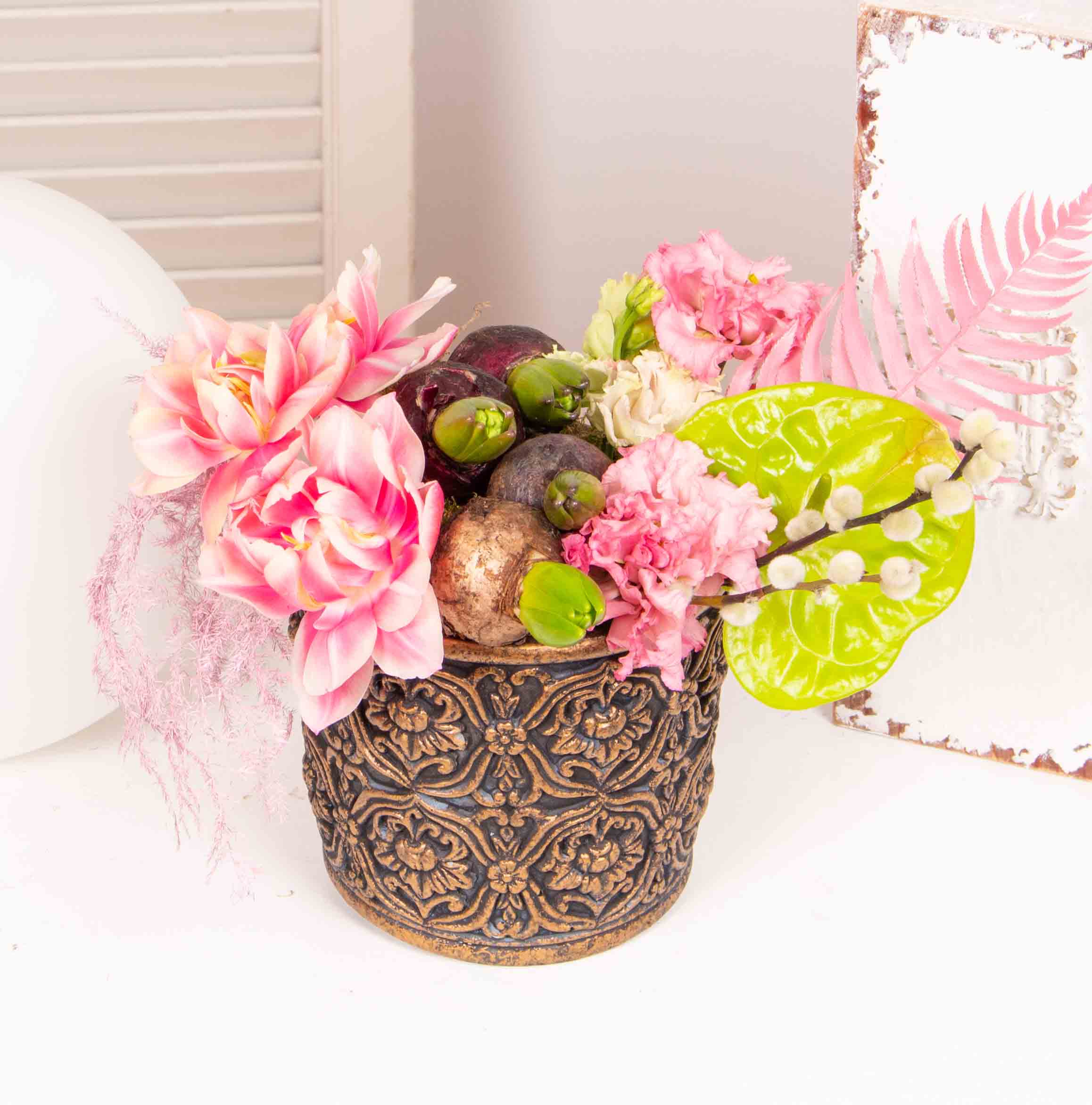 Aranjament cu bulbi, anthurium si lalele