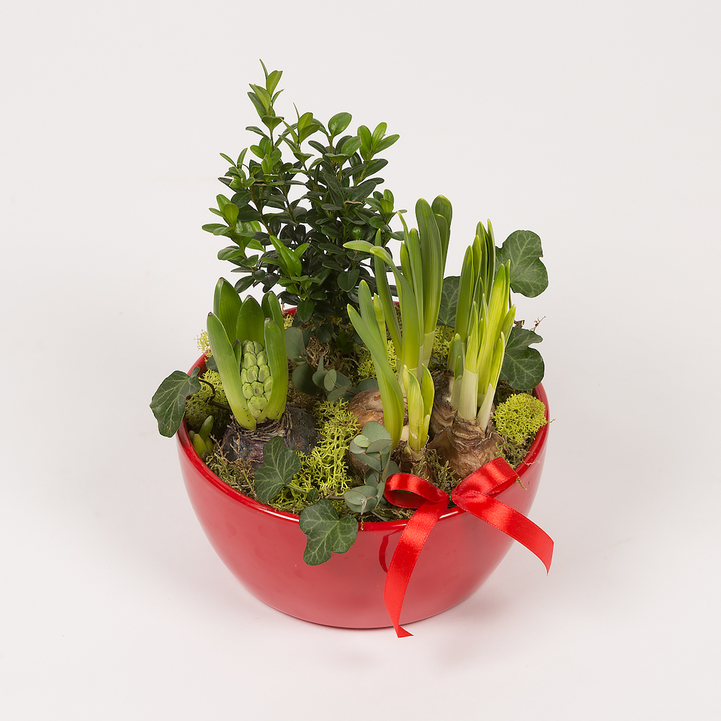 Aranjament in vas ceramic cu 1 bulb de zambila, 3 bulbi de narcisa, planta buxus, muschi verde, iedera si eucalipt.