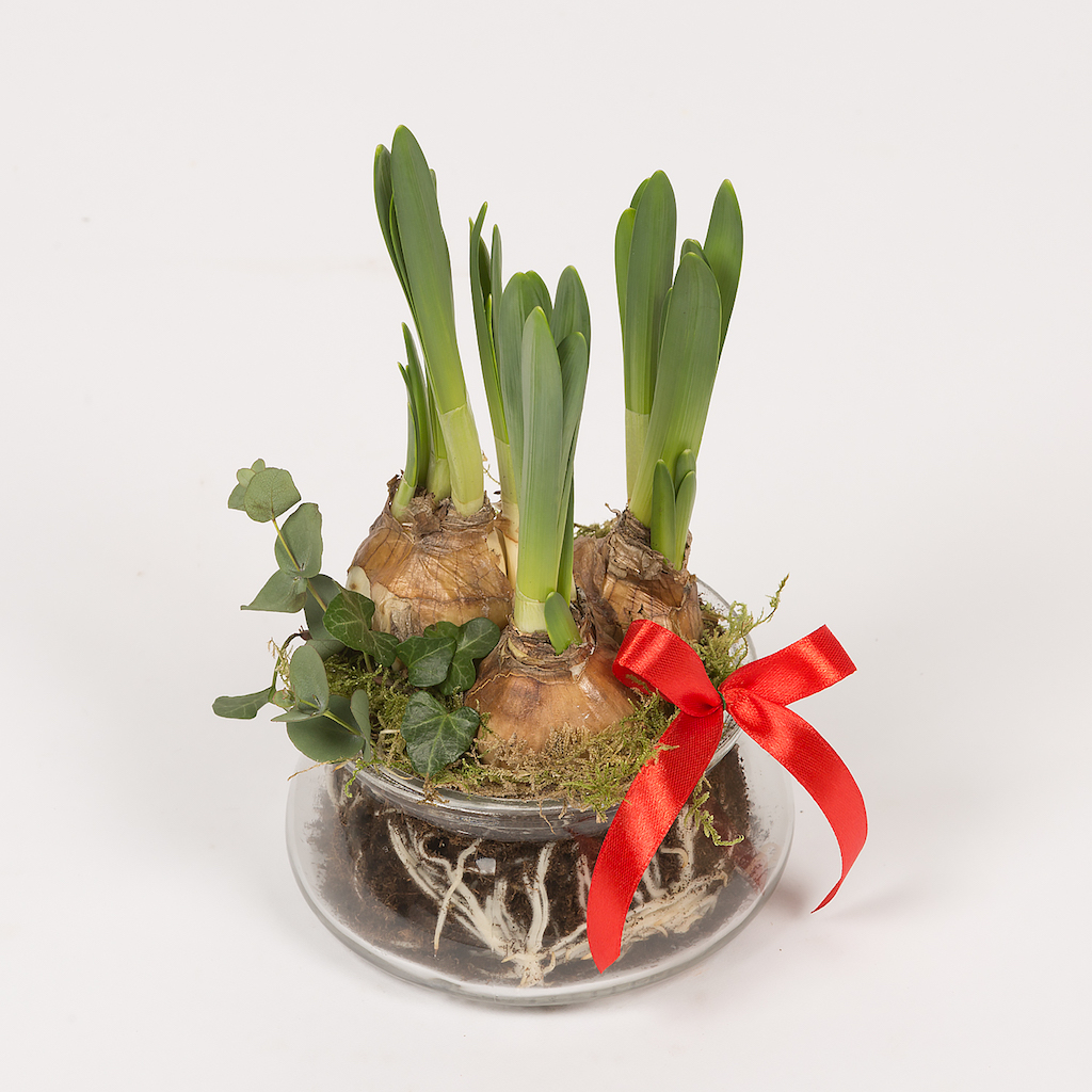 Aranjament in vas de sticla cu 3 bulbi de narcisa, muschi verde si iedera.