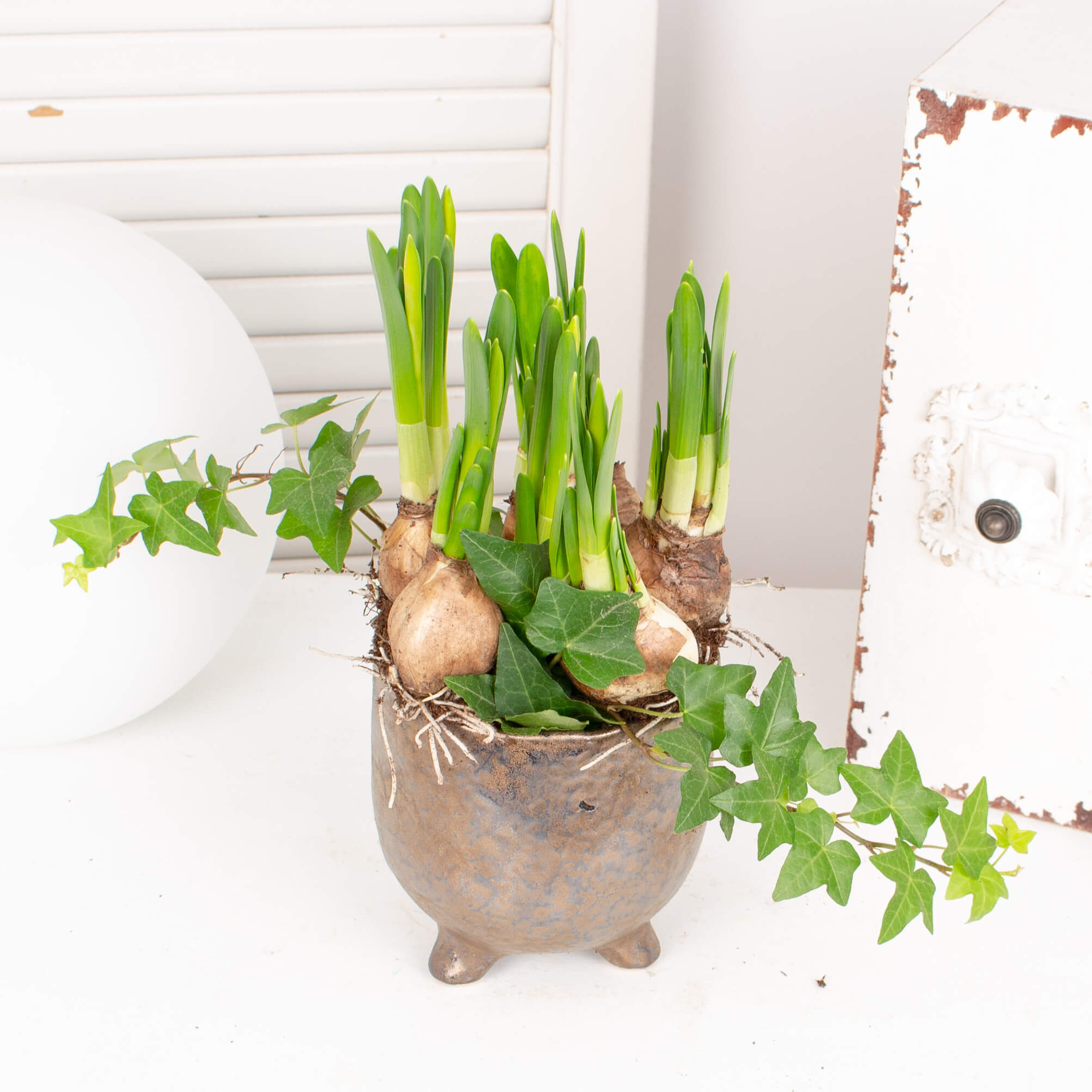 Aranjament in vas ceramic cu 5 bulbi de narcisa, iedera.