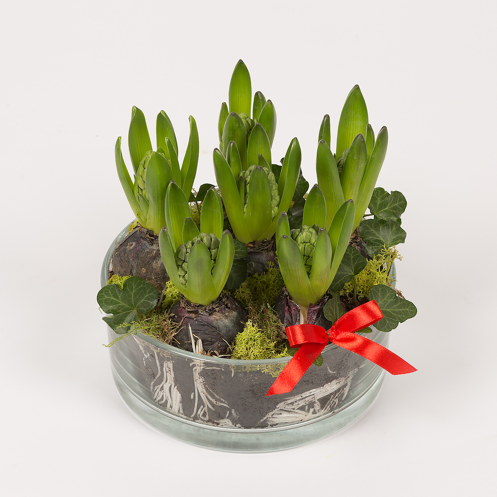 Aranjament in vas de sticla cu 6 bulbi de zambila, muschi verde si iedera.