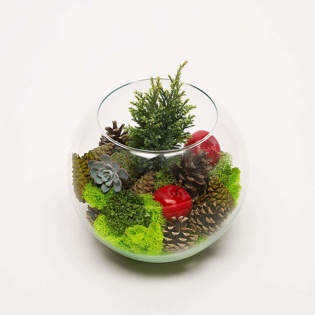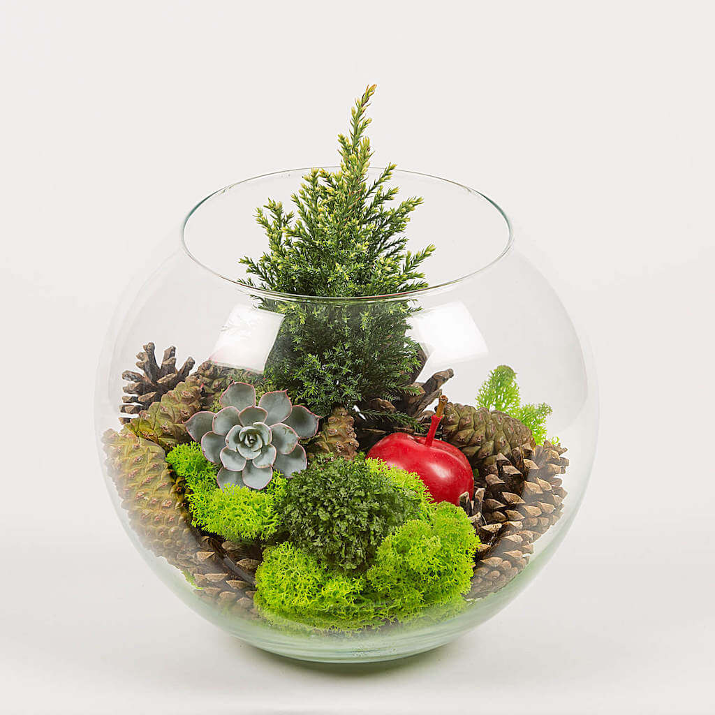 Craciunul il petrecem alaturi de familie si prieteni. Alaturi de oamenii pe care ii pretuim si carora le facem cadouri din suflet. Iar terariile si aranjamentele cu plante sunt cadourile care transmit gandurile noastre bune. Inspirati de magia sarbatorilor de iarna am realizat acest terariu cu conifere, mere cerate si echeveria. Cu un design deosebit si usor de intretinut, cu siguranta va infrumuseta orice casa. Si pentru ca sarbatorile de iarna au parfum de scortisoara si portocale, am ascuns printe aceste plante delicate o surpriza parfumata care ne va aduce aminte de copilarie.