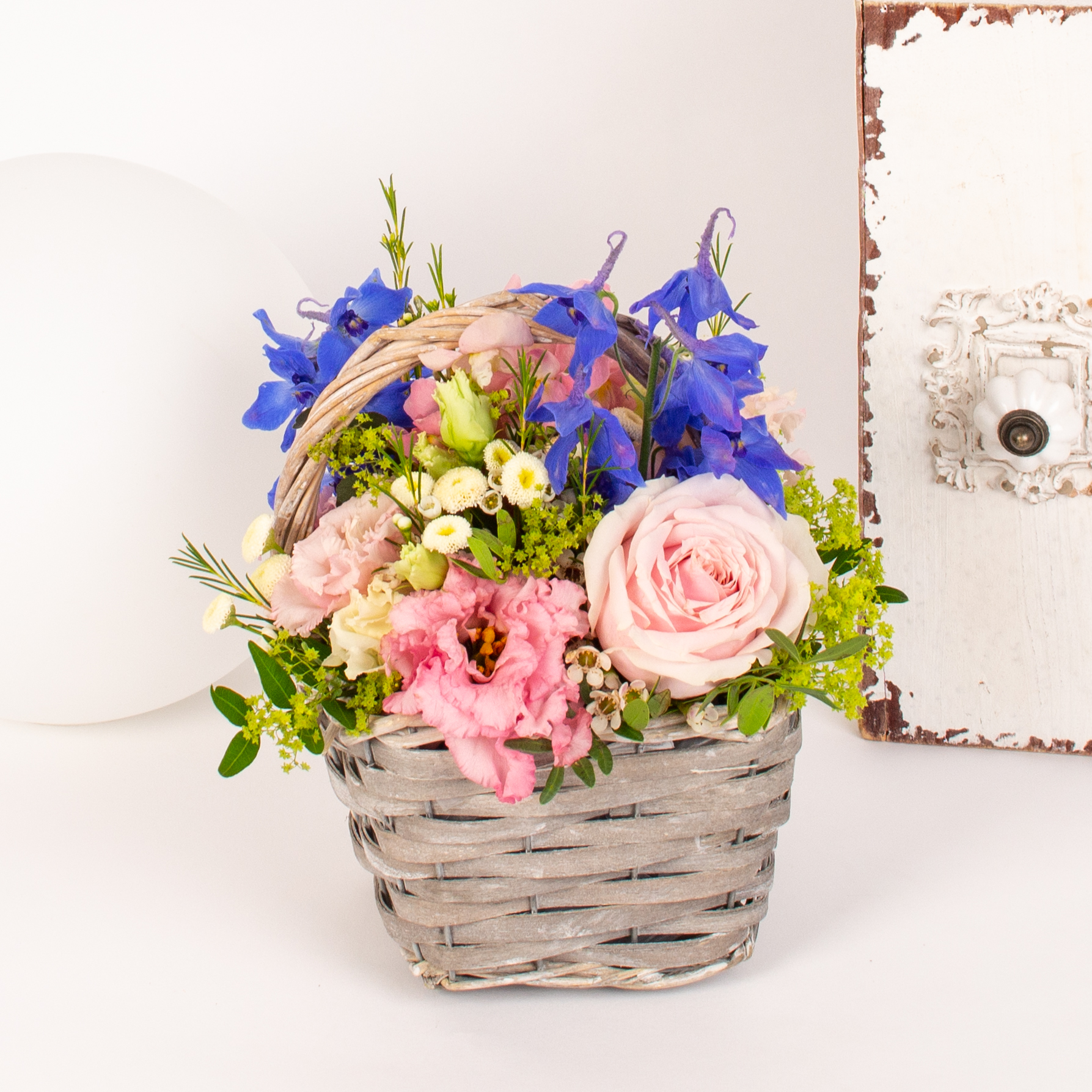 Aranjament in cos cu delphinium albastru, antirrhinum portocaliu, lisianthus roz, verdeata si alte flori de decor.