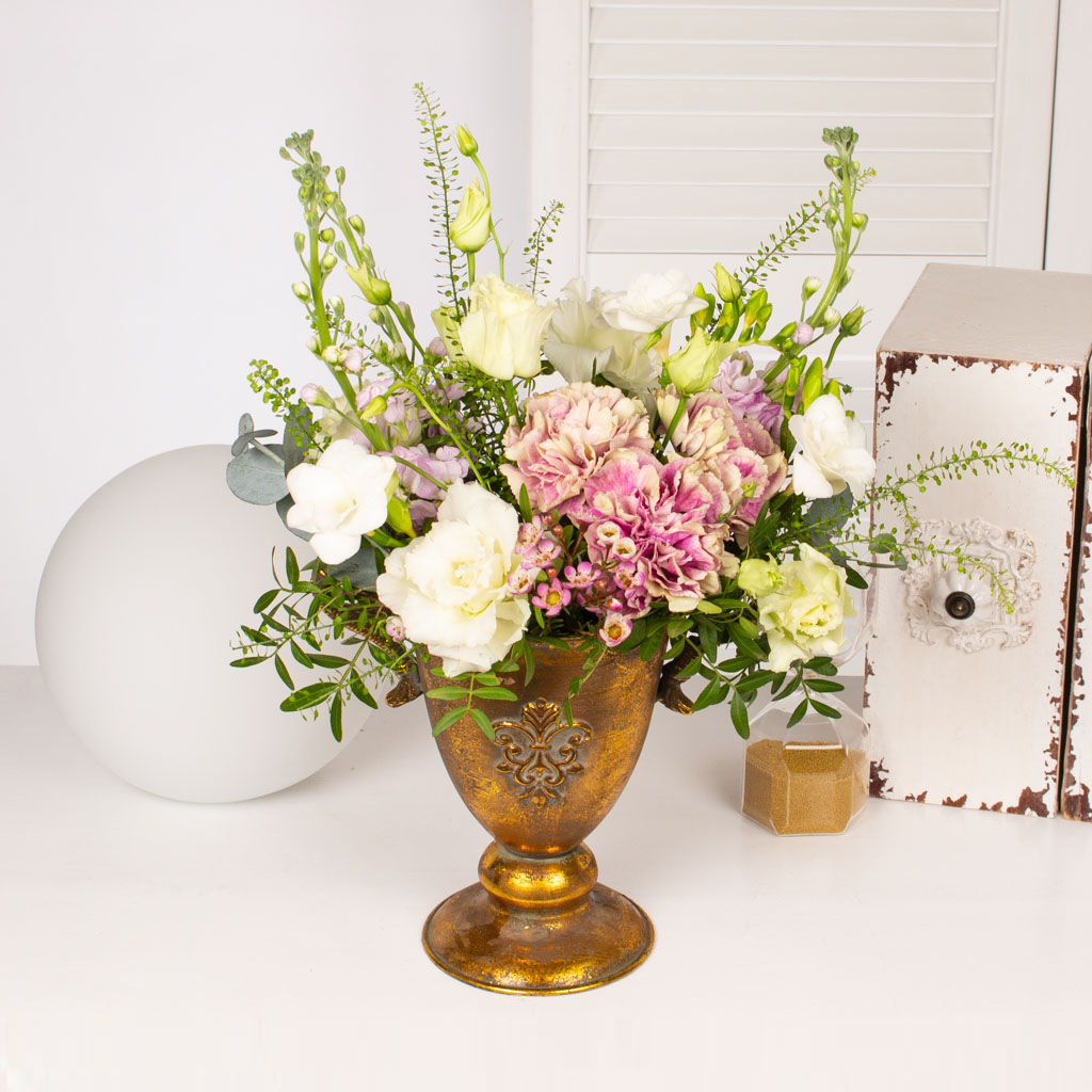 Aranjament cu urna aurie, 3 garoafe, lisianthus alb, 2 frezii albe, verdeata si alte flori de decor.