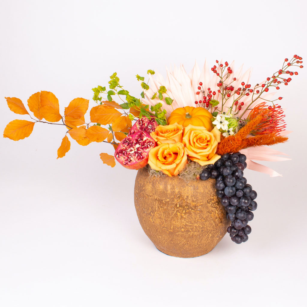 Iubim emotiile si bucuria pe care le vedem pe chipul celor care primesc flori si aranjamente florale pregatite in floraria Purple Flowers. De aceea ne straduim de fiecare data sa cream aranjamente unice care sa surprinda prin forma si culoare. Acest aranjament cu trandafiri portocalii, bostan portocaliu si alte flori este cadoul de care ai nevoie atunci cand vrei sa spui „Te iubesc!” unei persoane dragi.