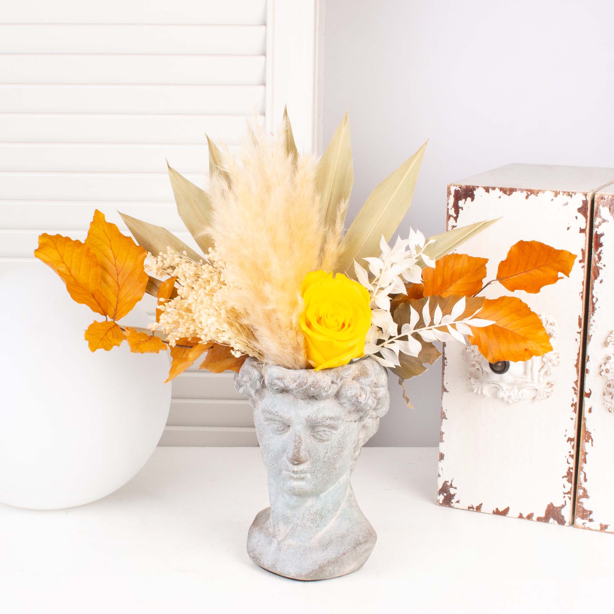 Vaza antichizata cu palmier conservat, trandafir conservat galben, pampas natur, 5 cupe de bumbac si alte flori de decor.