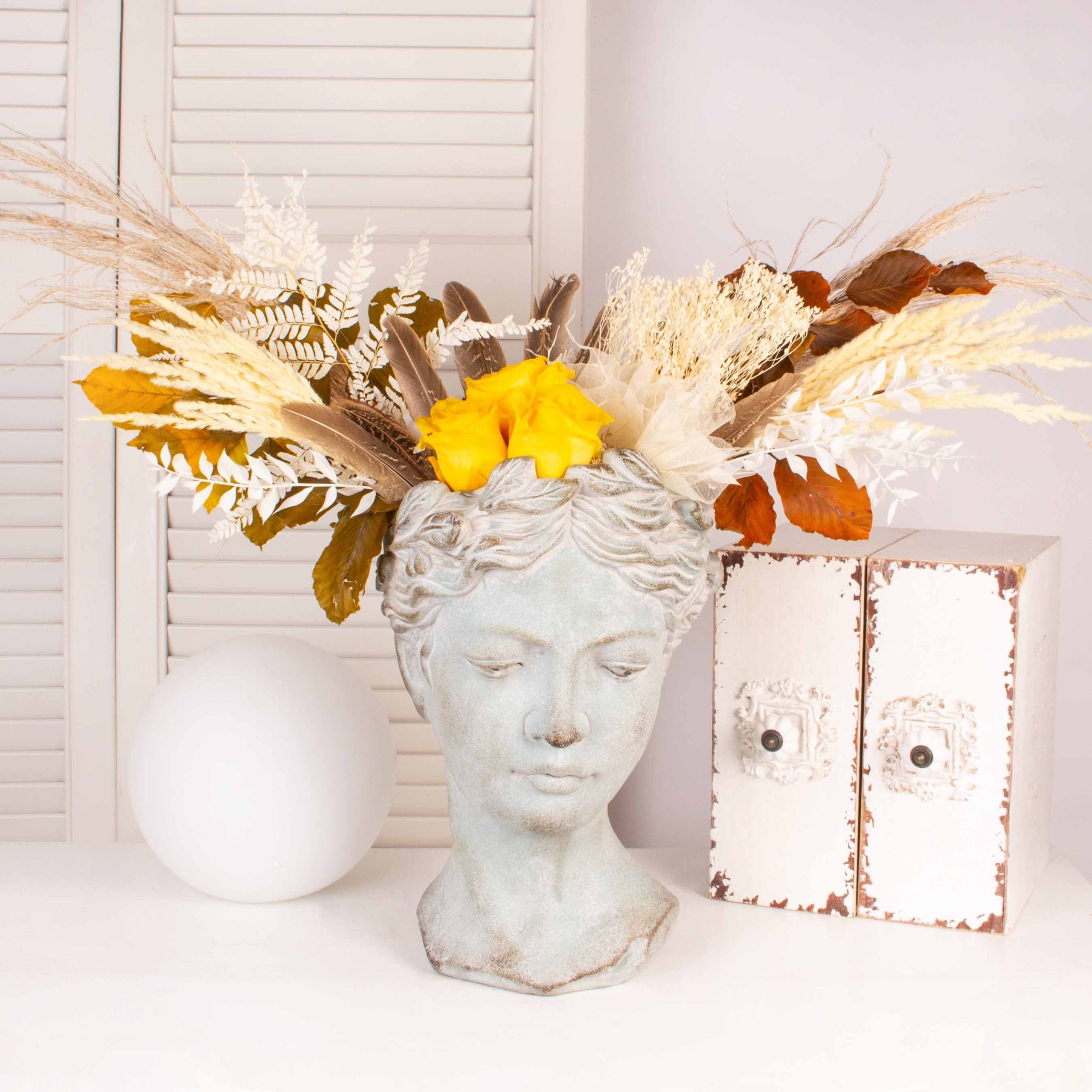 Vaza antichizata cu frunza de fag conservata, 8 pene maro, 10 cupe de bumbac, 3 trandafiri conservati galbeni si alte flori de decor.