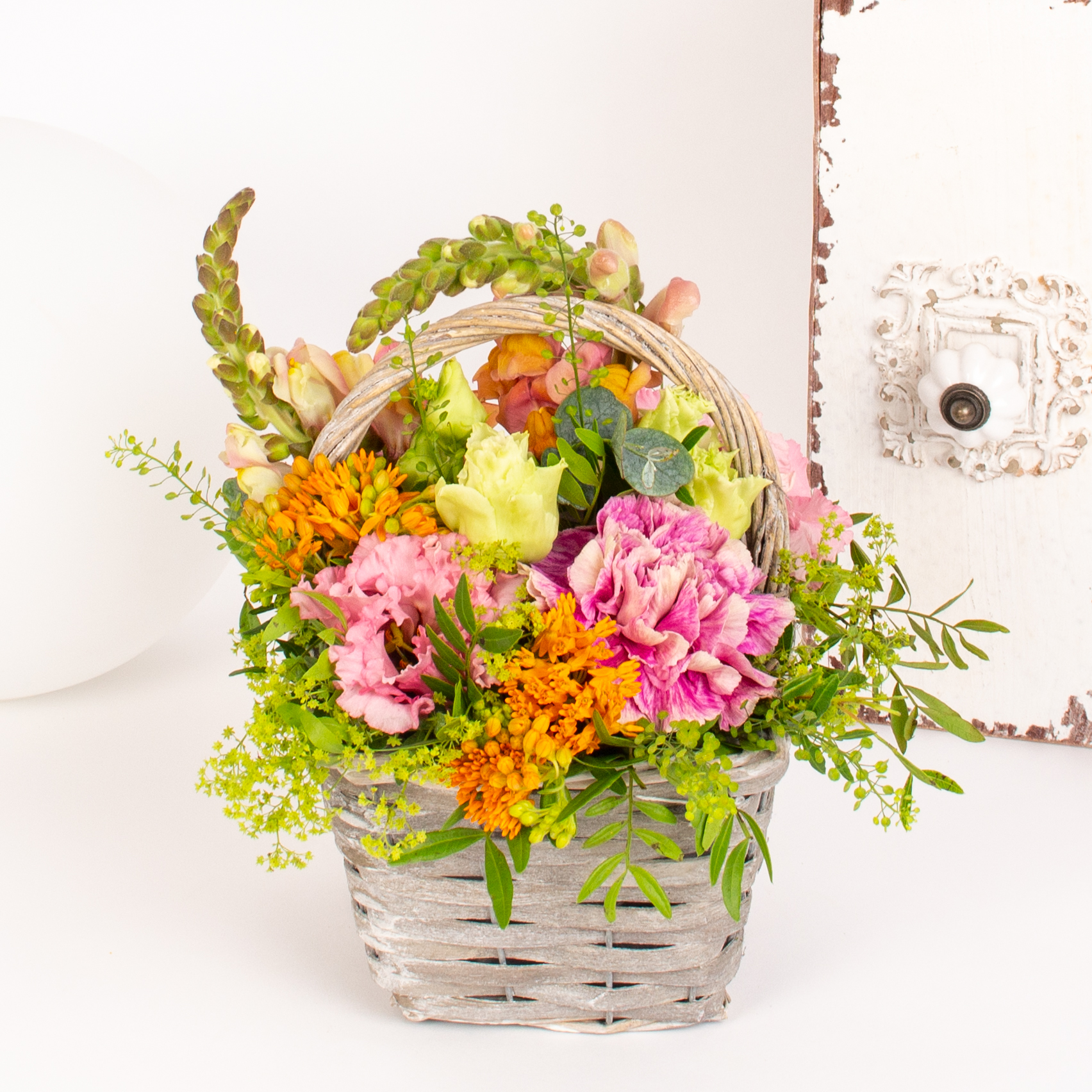 Aranjament in cos cu garoafa, lisianthus roz, 2 antirrhinum, verdeata si alte flori de decor.