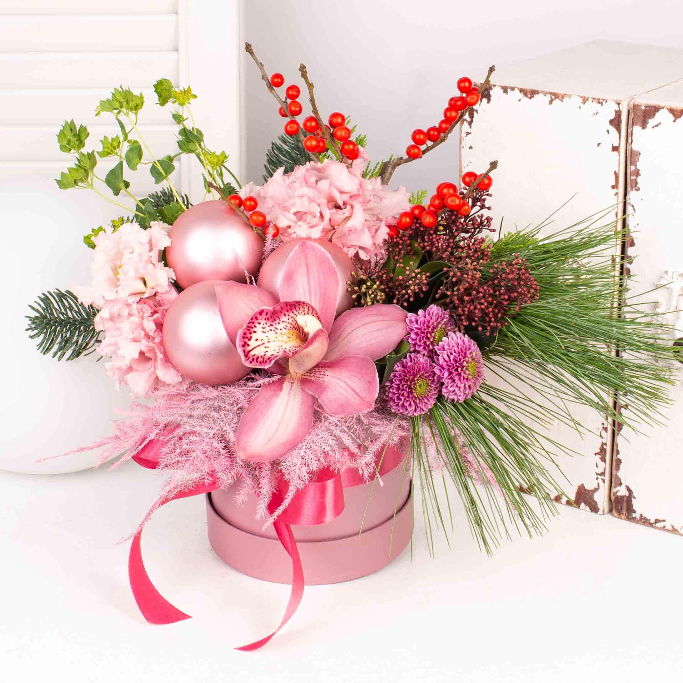 Aranjament in cutie cu 3 globuri mari roz, orhidee roz, ilex rosu, asparagus roz, lisianthus roz, verdeata si alte flori de decor.