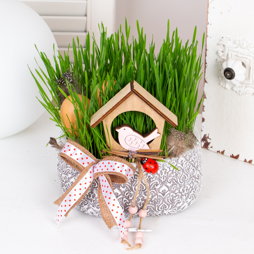 Aranjament in vas ceramic cu funda, grau incoltit, figurina medie casuta si alte elemente de decor.