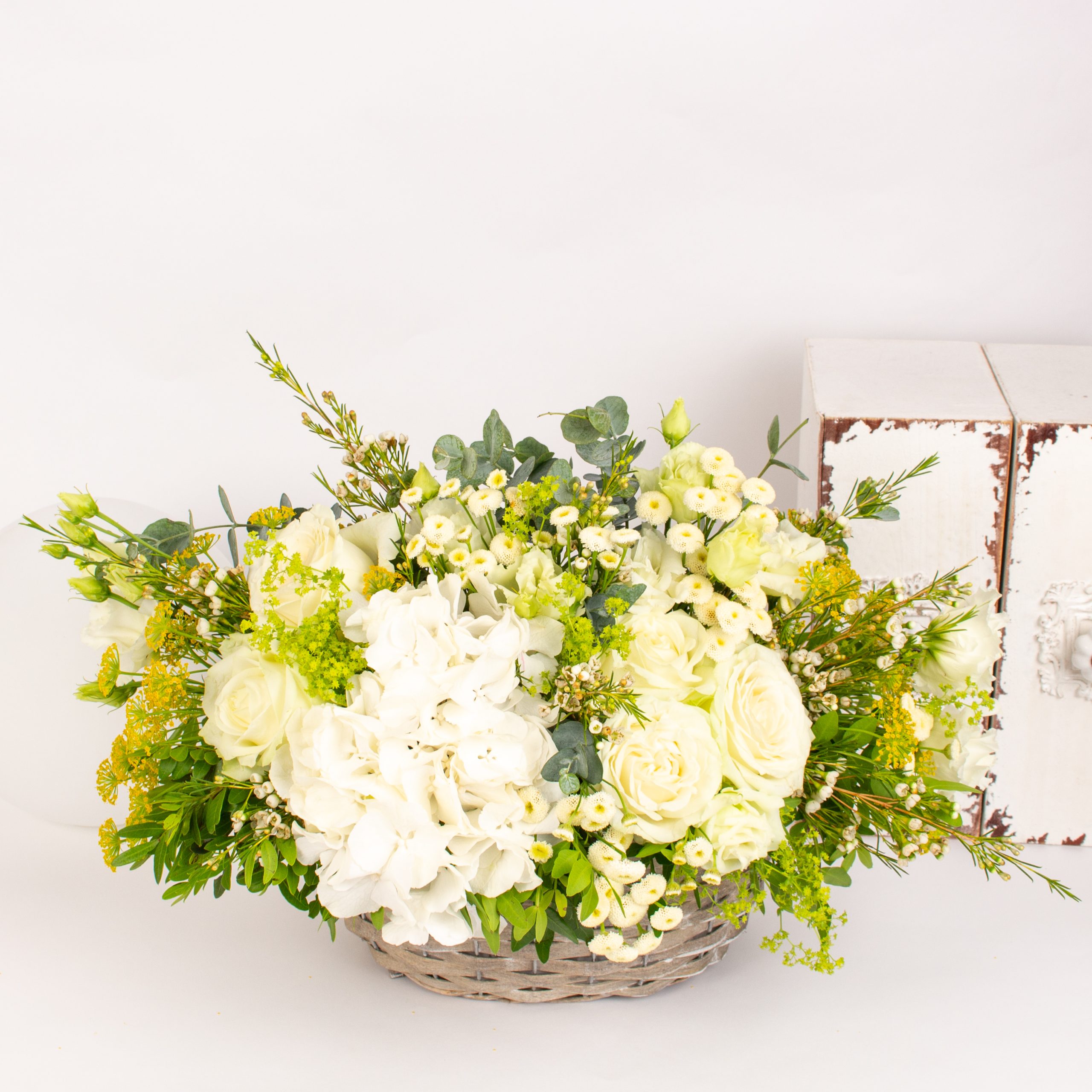 Aranjament in cos cu 5 trandafiri albi, hortensie alba, 2 lisianthus alb, 2 camelciu alb, verdeata si alte flori de decor.