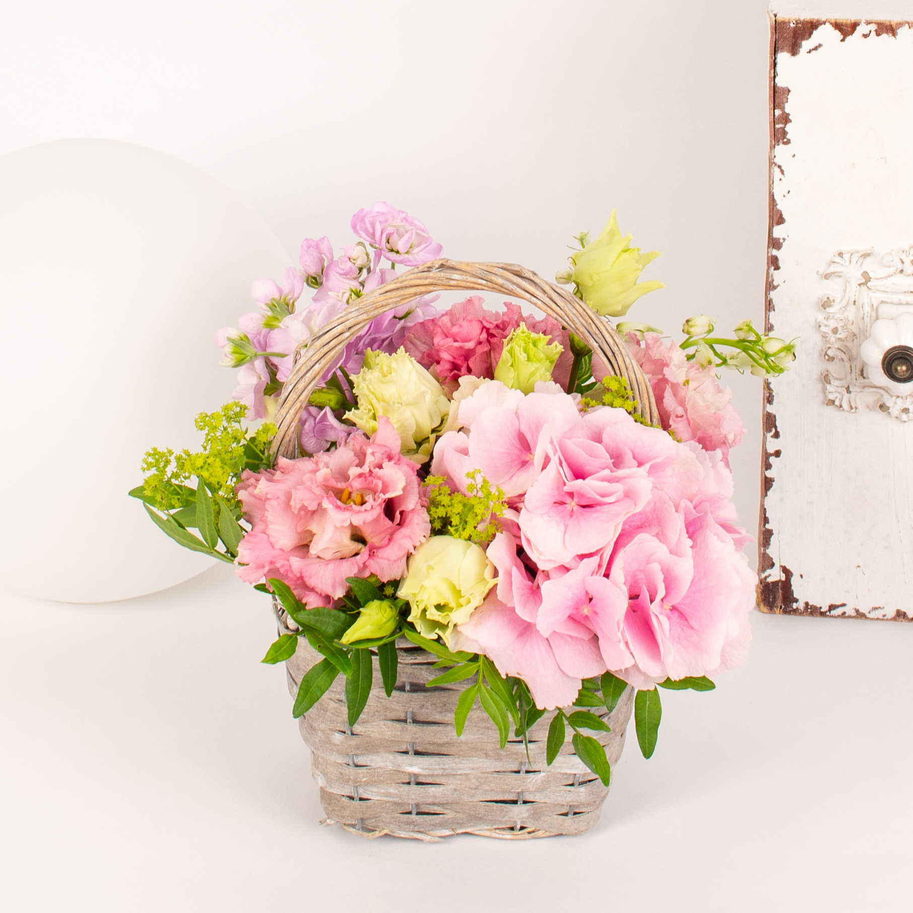 Aranjament in cos cu hortensie roz, lisianthus roz, matthiola roz, verdeata si alte flori de decor.