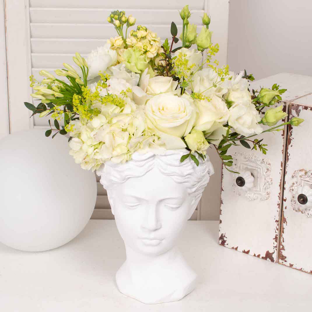 Aranjament cu hortensie, 3 trandafiri, 3 bujori albi, matthiola alba si alte flori de decor.