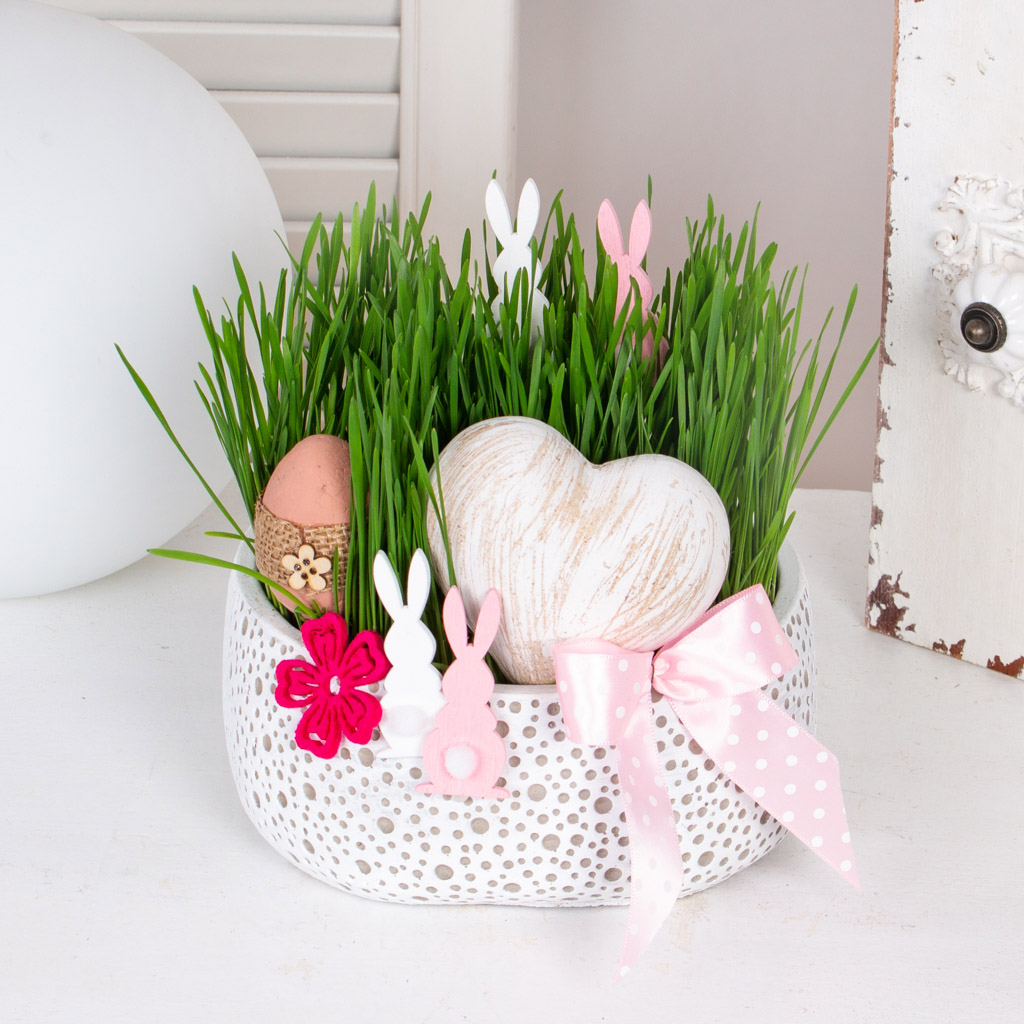 Aranjament in vas ceramic cu grau incoltit, funda, figurina medie inima si alte elemente de decor.