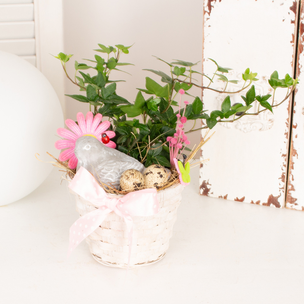 Aranjament in cos cu pasare din ciment, iedera, 2 oua de prepelita, verdeata si alte flori de decor.