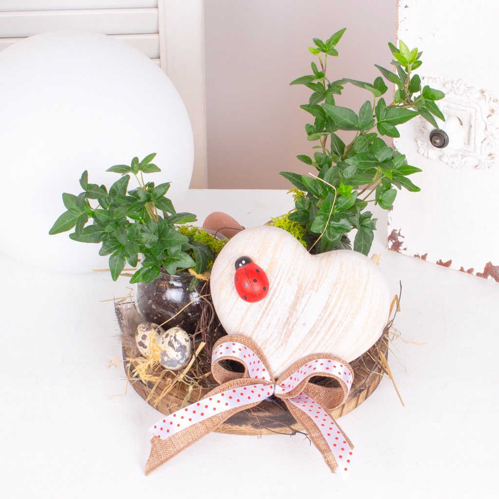 Aranjament in vas ceramic, funda, figurina mare inima din lemn, iedera si alte elemente de decor.