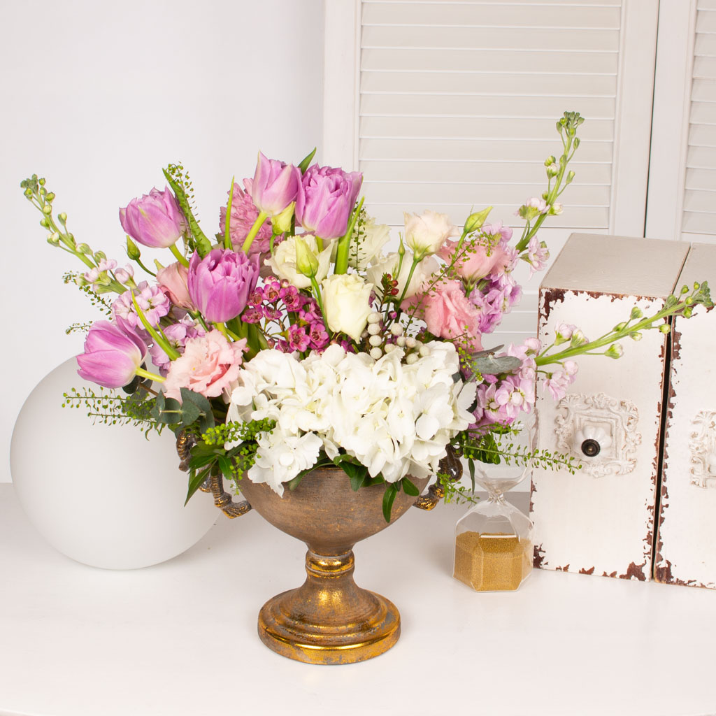 Aranjament cu urna aurie, 3 matthiola roz, zambila roz, 5 lalele mov, lisianthus alb, verdeata si alte flori de decor.