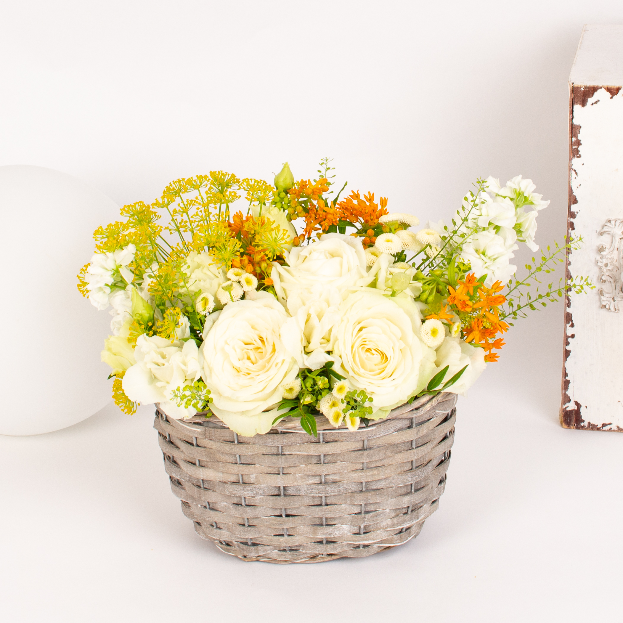 Aranjament in cos cu 3 trandafiri albi, 2 matthiola alba, lisianthus alb, verdeata si alte flori de decor.