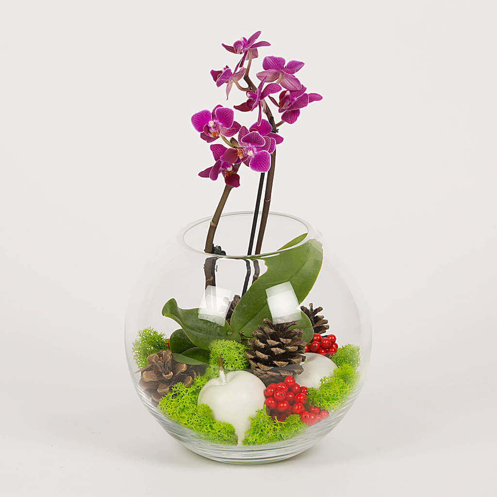 Craciunul il petrecem alaturi de familie si prieteni. Alaturi de oamenii pe care ii pretuim si carora le facem cadouri din suflet. Iar terariile si aranjamentele cu plante sunt cadourile care transmit gandurile noastre bune. Inspirati de magia sarbatorilor de iarna am realizat acest terariu cu mere, conuri si orhidee. Cu un design deosebit si usor de intretinut, cu siguranta va infrumuseta orice casa. Si pentru ca sarbatorile de iarna au parfum de scortisoara si portocale, am ascuns printe aceste plante delicate o surpriza parfumata care ne va aduce aminte de copilarie.