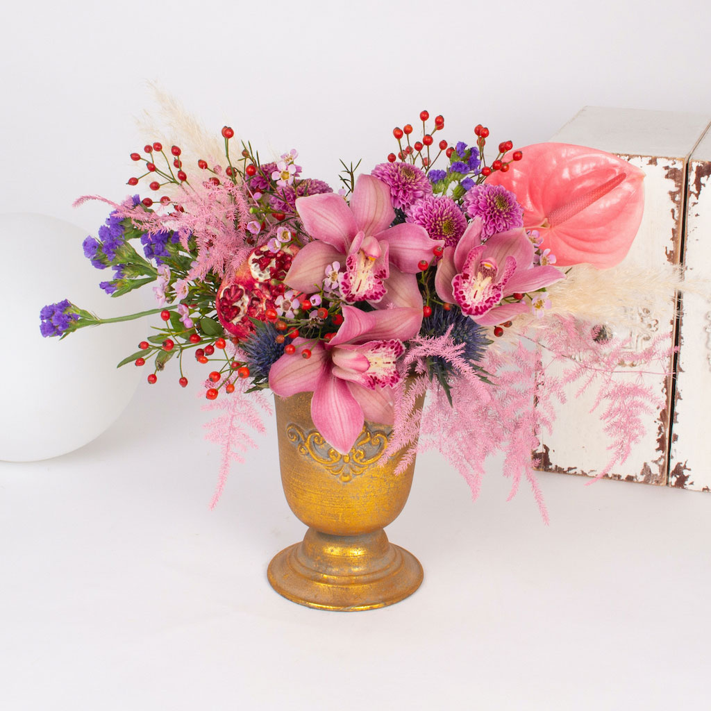 Aranjament in urna aurie cu 3 crengute de macese, 3 orhidee cymbidium, anthurium roz, crizantema santini roz, verdeata si alte flori de decor.