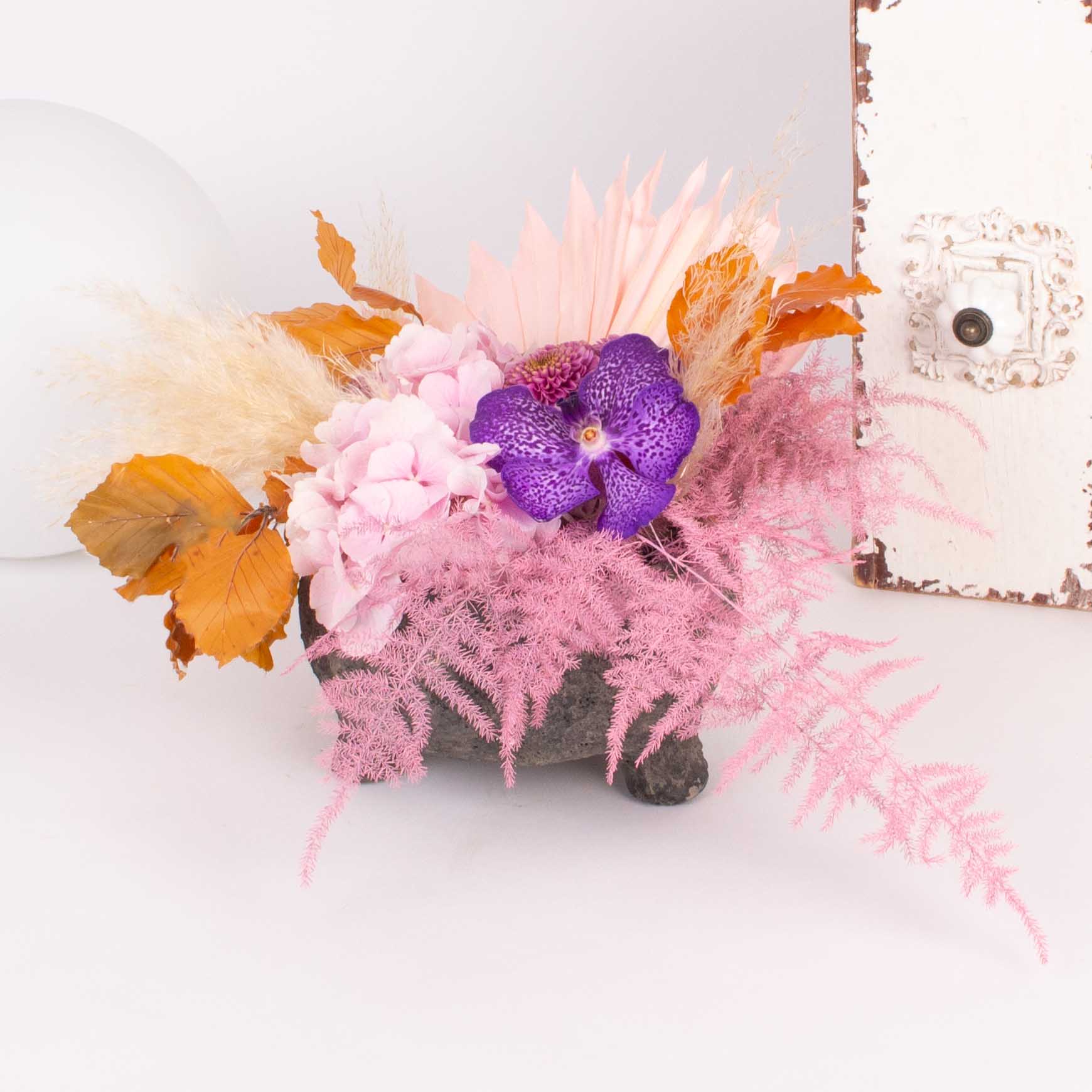 Aranjament in vas ceramic cu palmier conservat roz, crizantema santini roz, fir de pampas, hortensie, verdeata si alte flori de decor.
