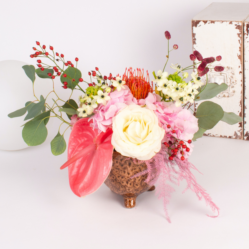 Iubim emotiile si bucuria pe care le vedem pe chipul celor care primesc flori si aranjamente florale pregatite in floraria Purple Flowers. De aceea ne straduim de fiecare data sa cream aranjamente unice care sa surprinda prin forma si culoare. Acest aranjament cu protea, trandafiri si alte flori este cadoul de care ai nevoie atunci cand vrei sa spui „Te iubesc!” unei persoane dragi.