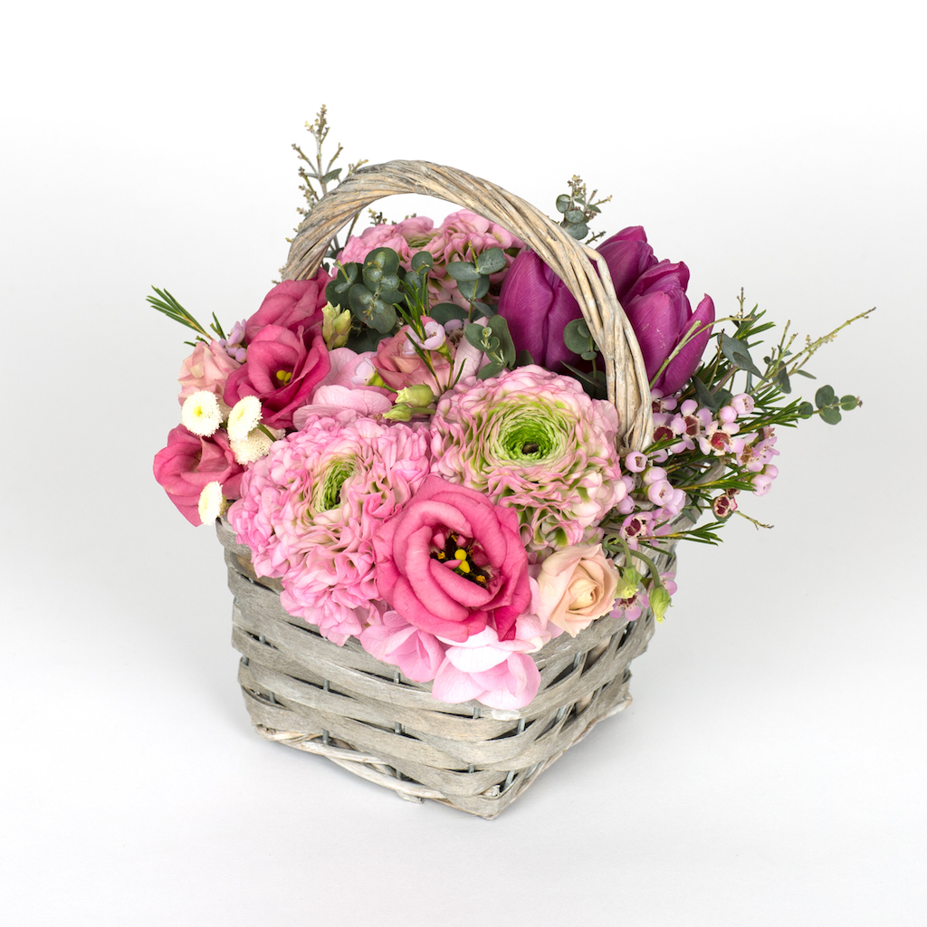 Aranjament cu 3 ranunculus roz, 2 lisianthus roz, 3 lalele mov, verdeata si alte flori de decor, cos gri cu toarta.