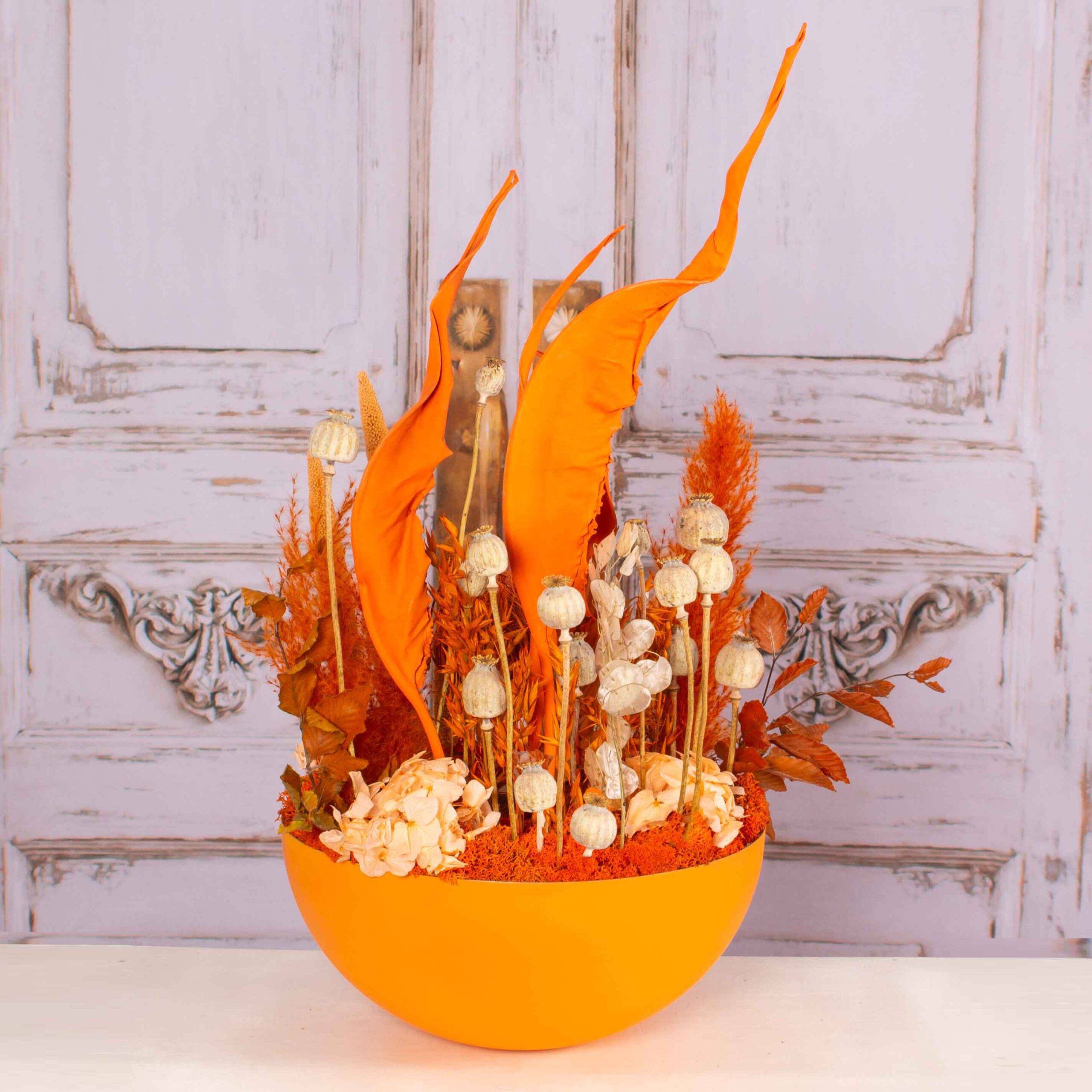 Florile daruite din suflet transmit emotii frumoase celor dragi. Iar acest aranjament cu strelitzia portocalie, palmier conservat  si alte flori si frunze uscate, este cadoul perfect pentru cei care iubesc florile nemuritoare. Este alegerea perfecta pentru a transforma o zi obisnuita intr-o amintire frumoasa care sa reziste peste ani. Cu siguranta un astfel de cadou le va insenina ziua celor dragi! Adauga un mesaj personalizat si transforma o zi banala intr-o amintire frumoasa!