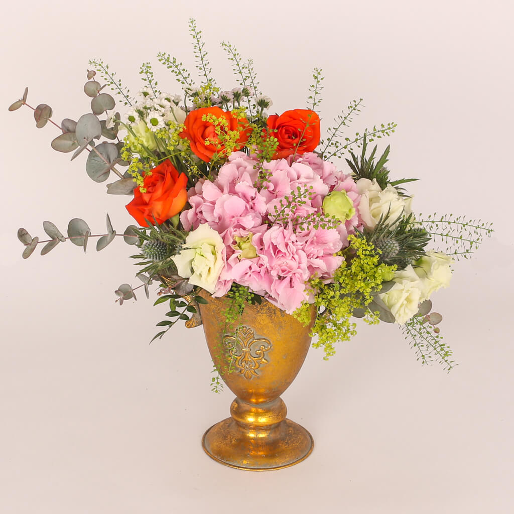 Urna aurie cu hortensie roz, 3 trandafiri portocalii, 2 lisianthus alb, verdeata si alte flori de decor.