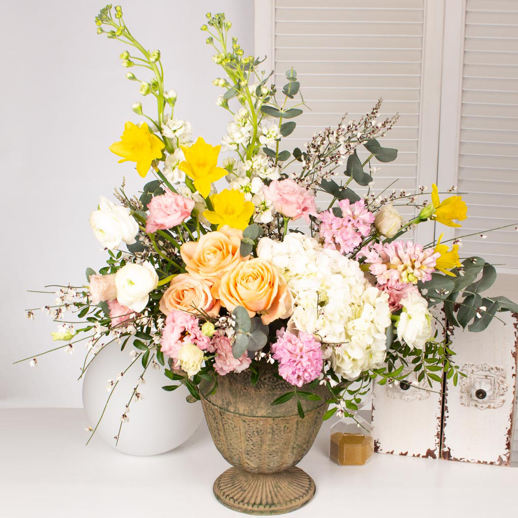 Iubim emotiile si bucuria pe care le vedem pe chipul celor care primesc flori si aranjamente florale pregatite in floraria Purple Flowers. De aceea ne straduim de fiecare data sa cream aranjamente unice care sa surprinda prin forma si culoare. Acest aranjament cu trandafir, zambile, narcise si alte flori este cadoul de care ai nevoie atunci cand vrei sa spui „Te iubesc!” unei persoane dragi.