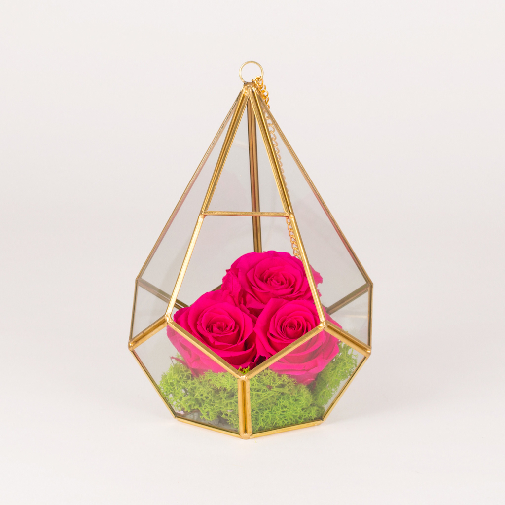 Prisma diamant L15cm h23cm cu 3 trandafiri roz conservati, muschi verde si cuib mic.