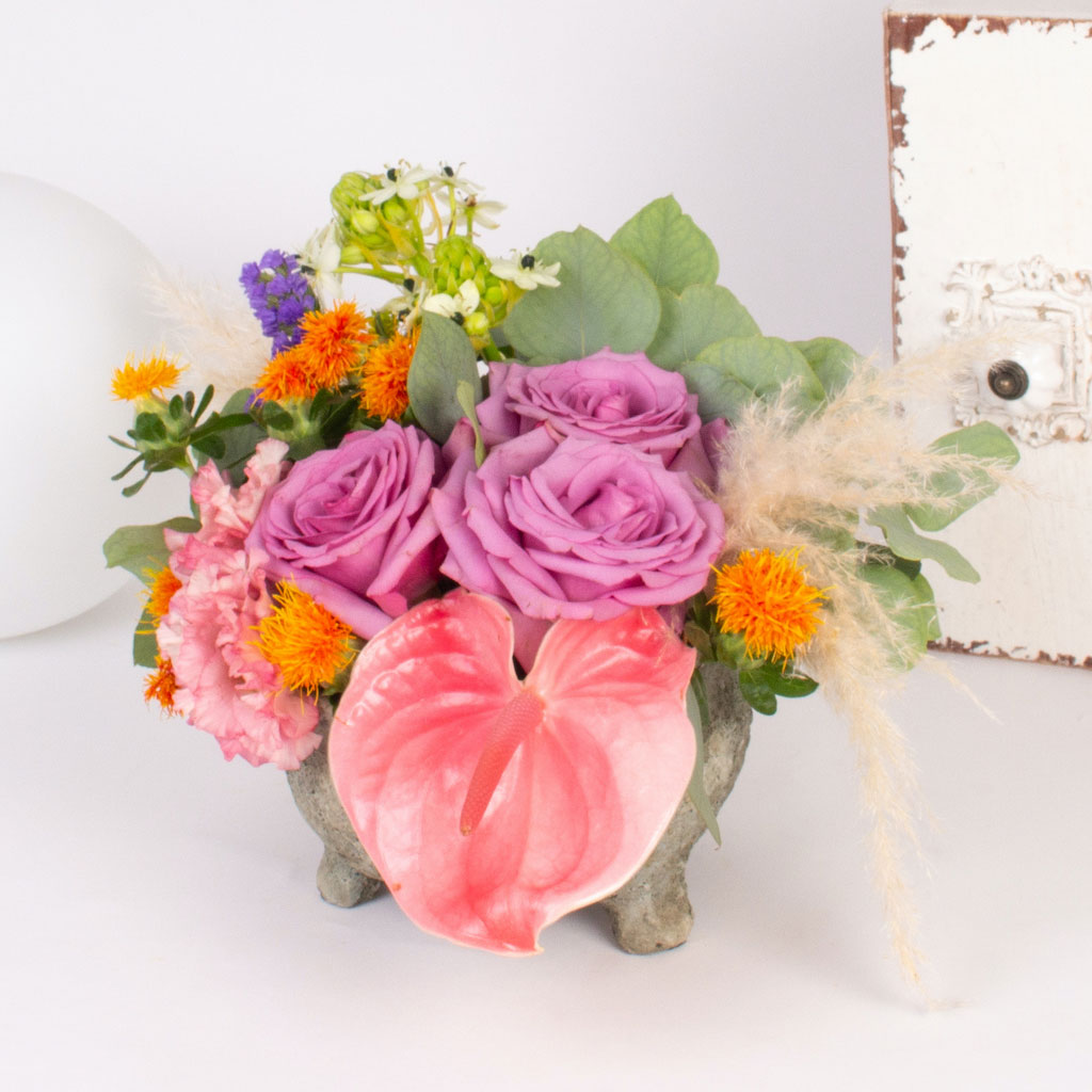 Aranjament in vas ceramic cu 3 trandafiri, anthurium roz, fir de pampas, lisianthus roz, verdeata si alte flori de decor.