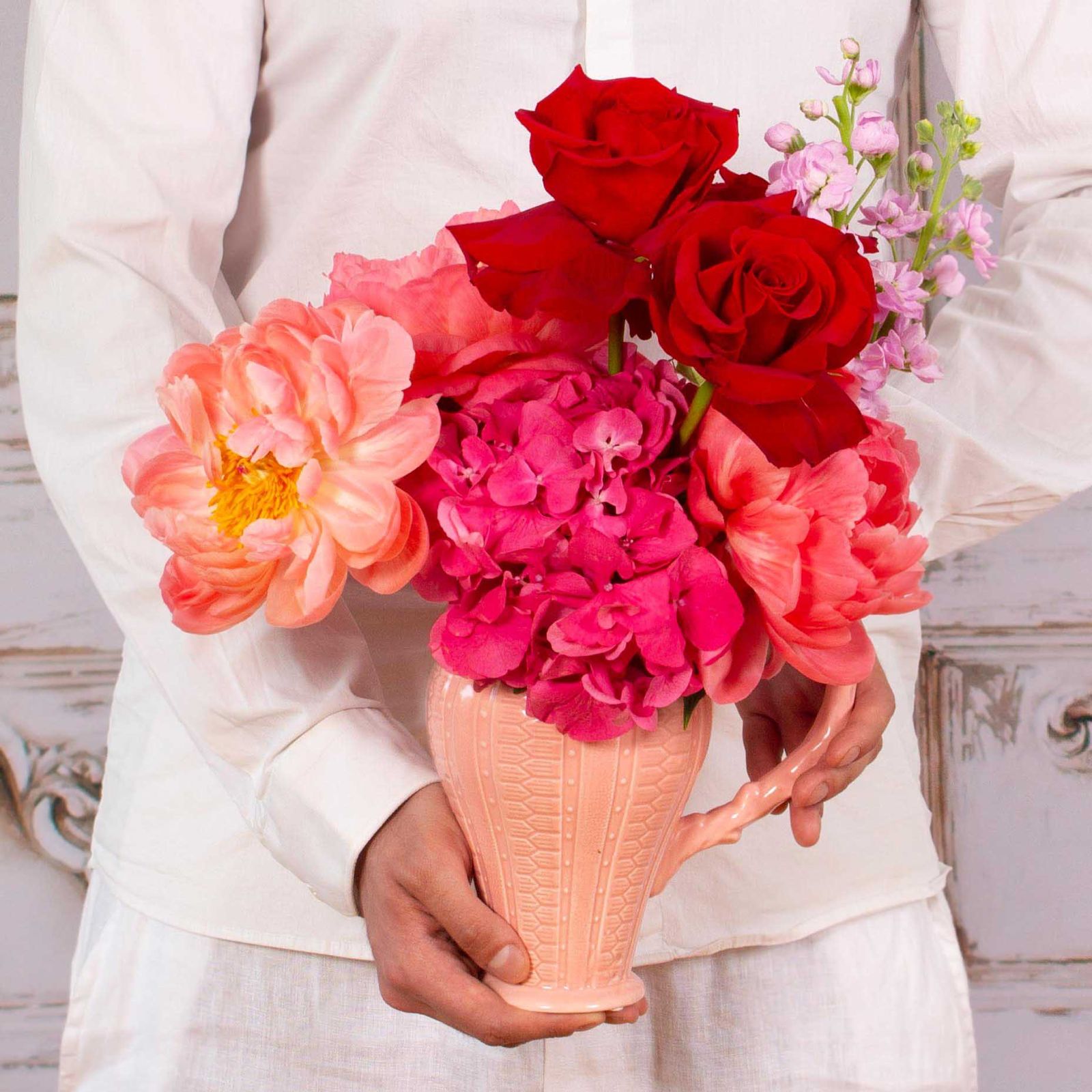 Aranjament in vas ulcior mare, 1 hortensia roz, 1 ranunculus, 3 fir trandafir roz, 3 anthirinum, 3 garoafa, 2 agapanthus alb, verdeata si alte flori de decor.