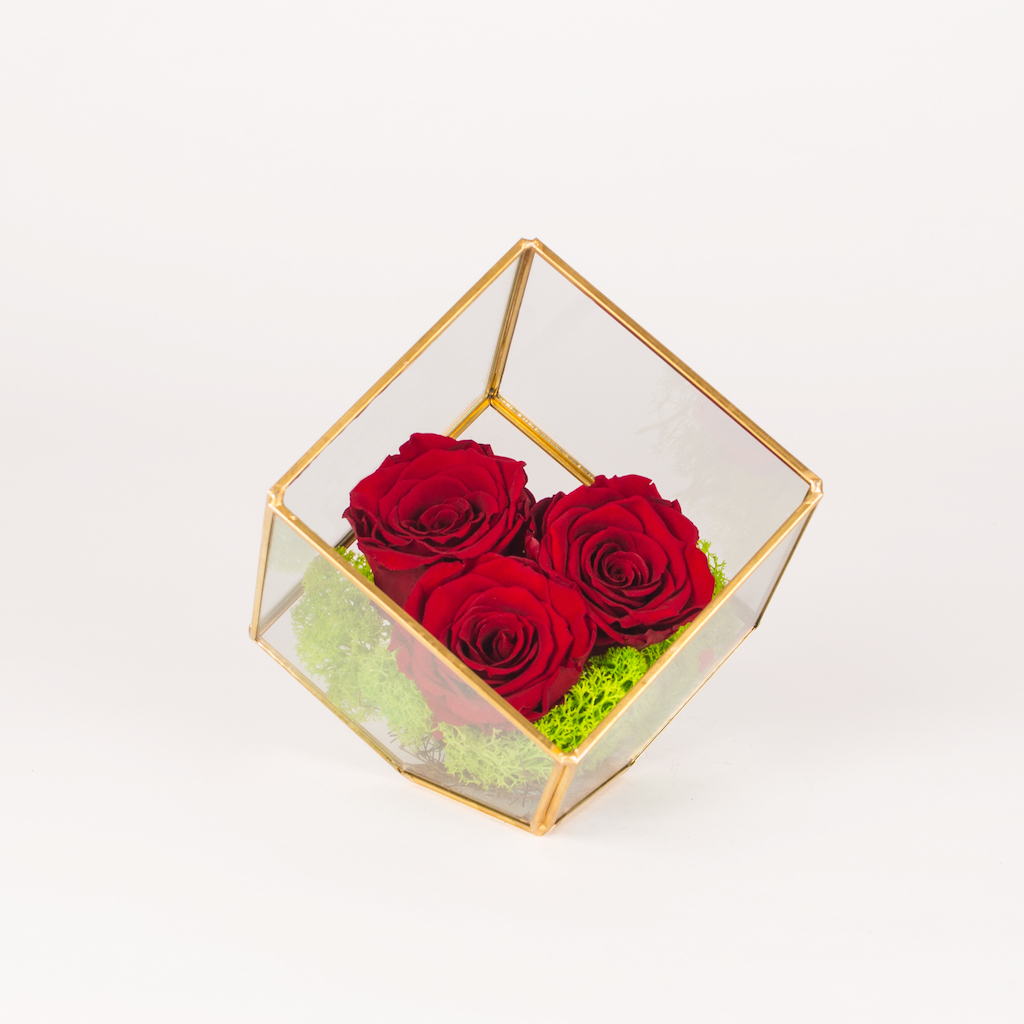 Dimensiunile terariului: latime 13cm, inaltime 20cm. 3 trandafiri conservati rosii si muschi