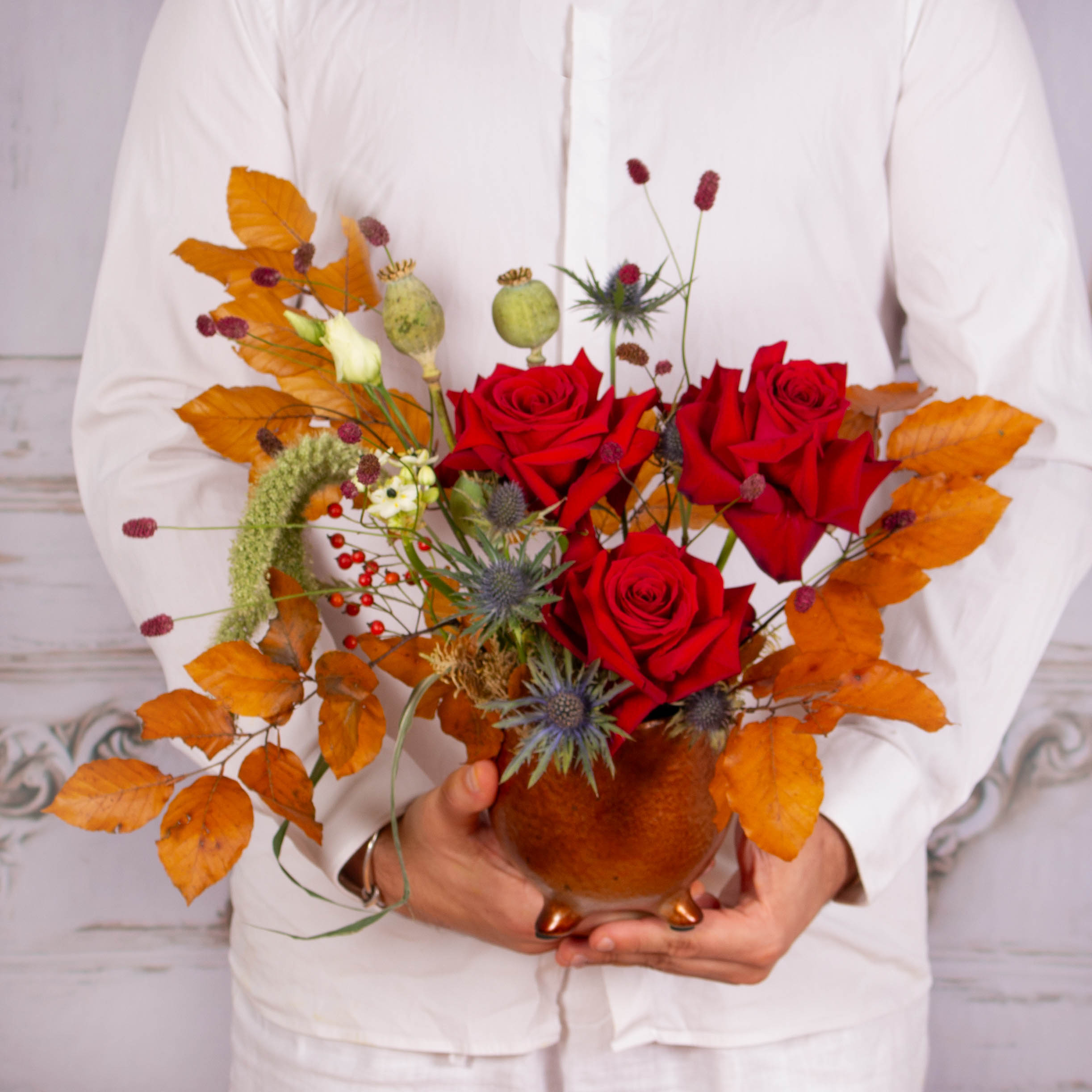 Aranjament in vas cu 3 trandafiri, 1 eryngium, 2 papaver si alte flori