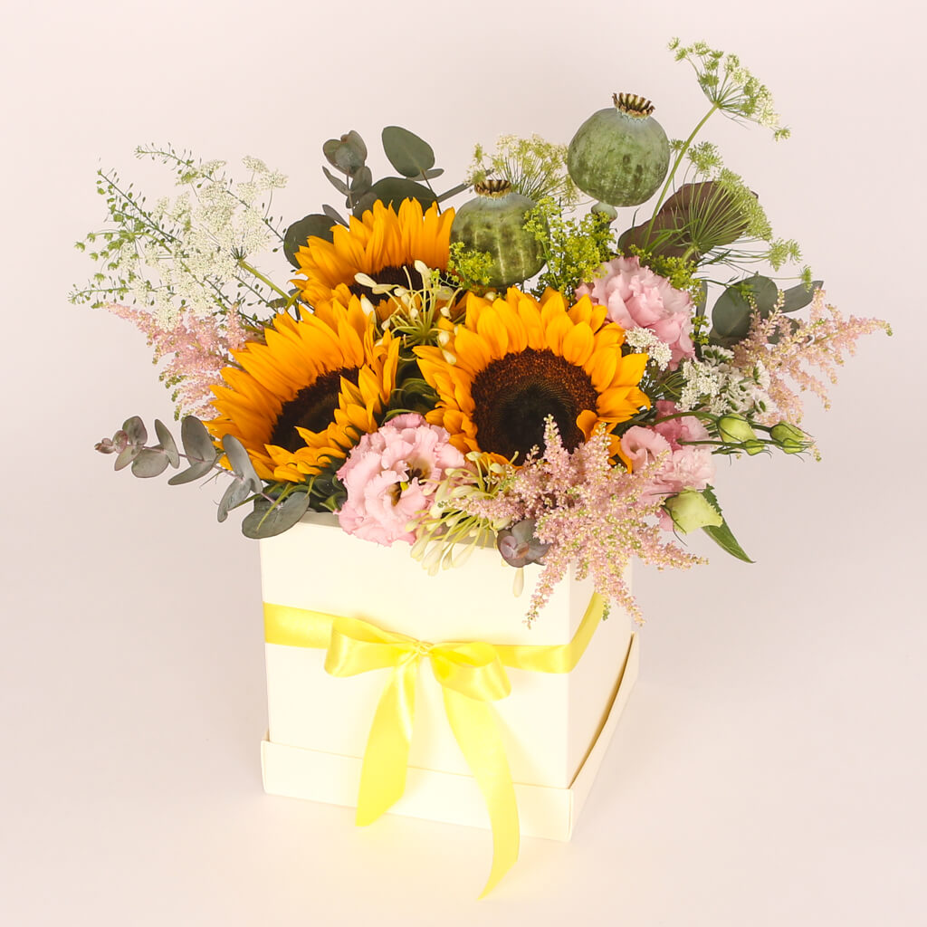 Cutie ivoire cu 3 floarea soarelui, 2 lisianthus roz, crizantema santini alba, verdeata si alte flori. Dimensiunile cutiei 17x17x17