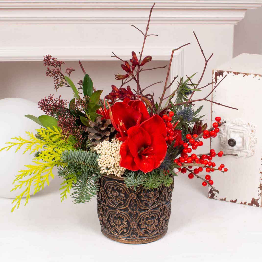 Aranjament de Craciun cu ilex, amaryllis si alte flori