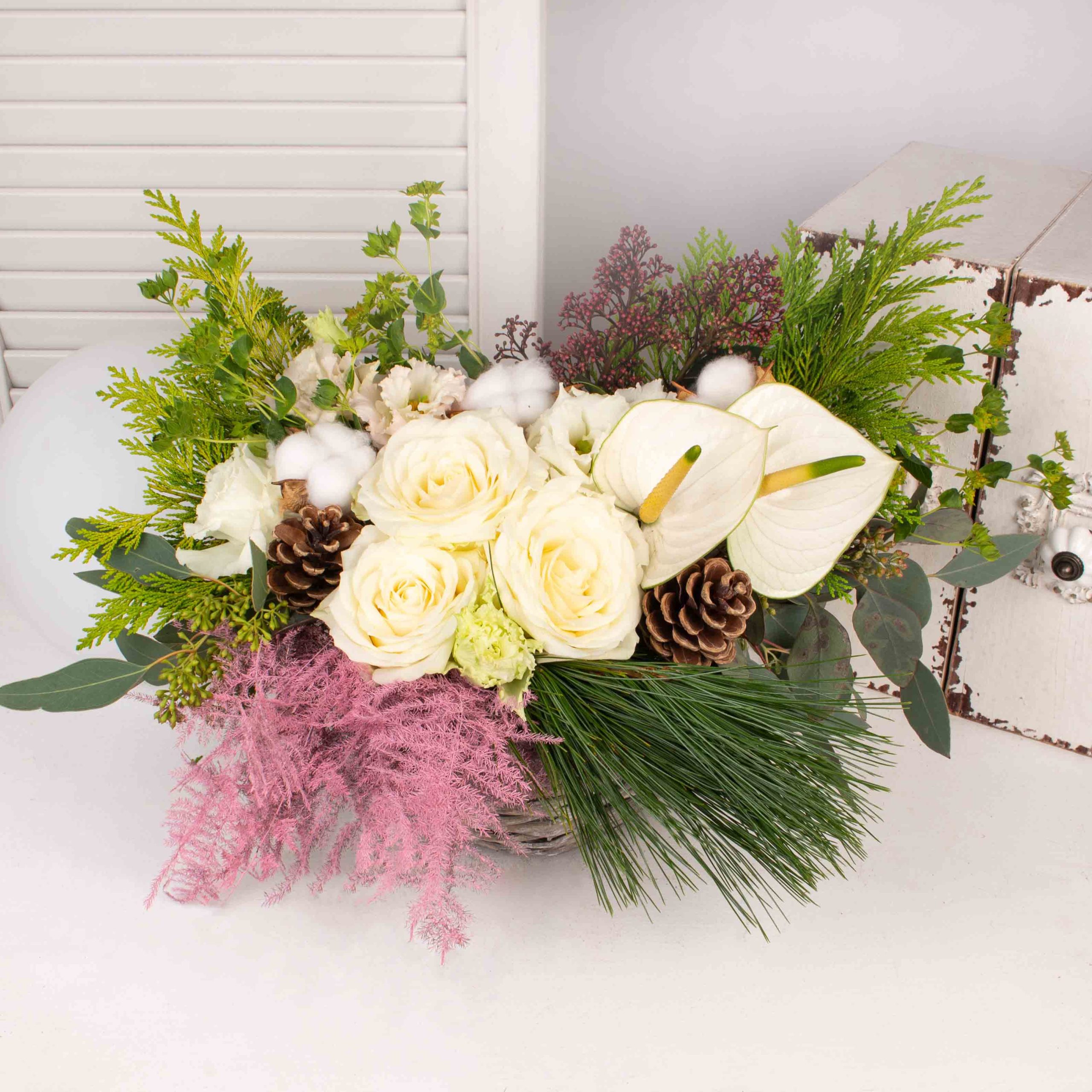 Aranjament in cos gri cu 3 trandafiri albi, 2 conuri de pin, 2 anthurium alb, 3 cupe de bumbac, 2 asparagus roz, verdeata si alte flori de decor.
