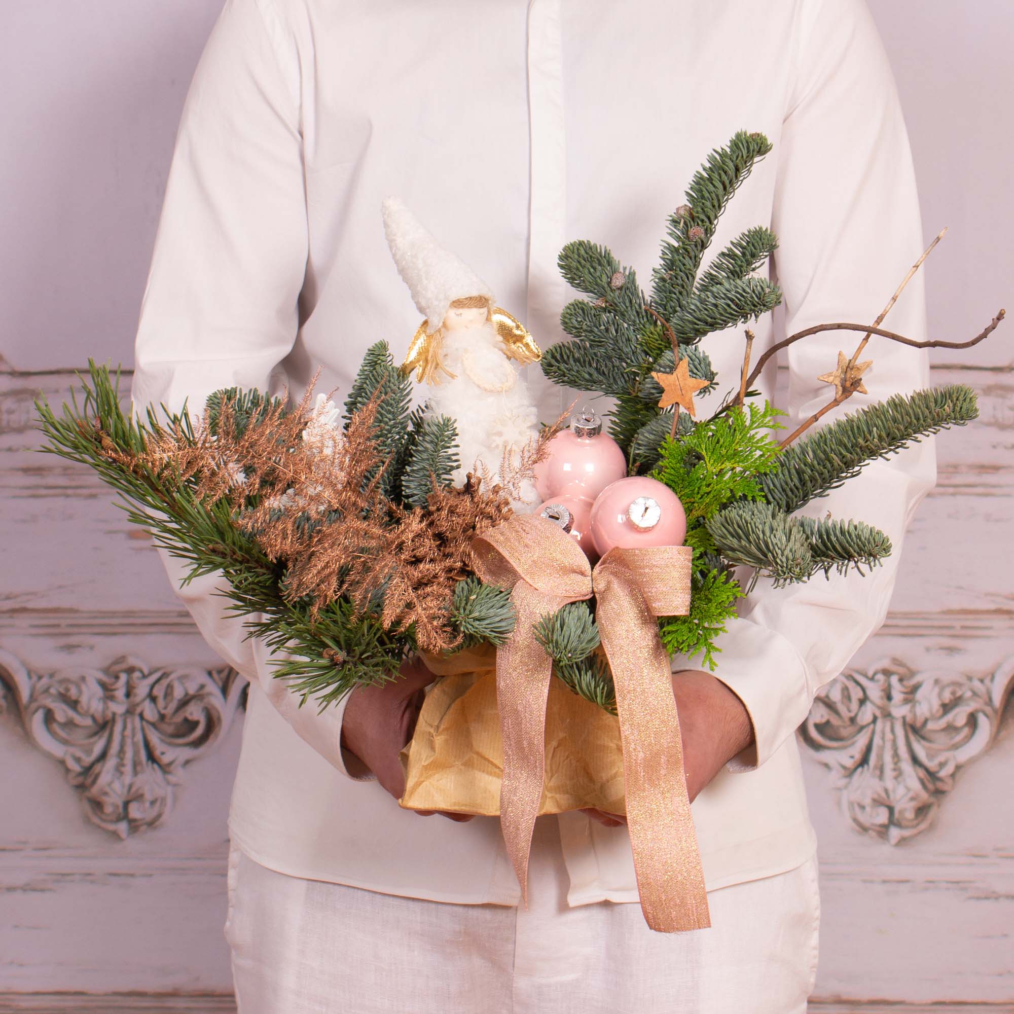Aranjament cu fetita ingeras, globuri roz si altele(unele decoratiuni pot fi usor diferite)
