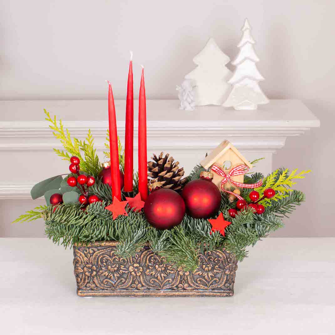 Vas dreptunghiular cu 2 globuri mari rosii, glob mediu rosu, 3 globuri mici rosii, con de pin uscat, verdeata si alte elemente de decor.