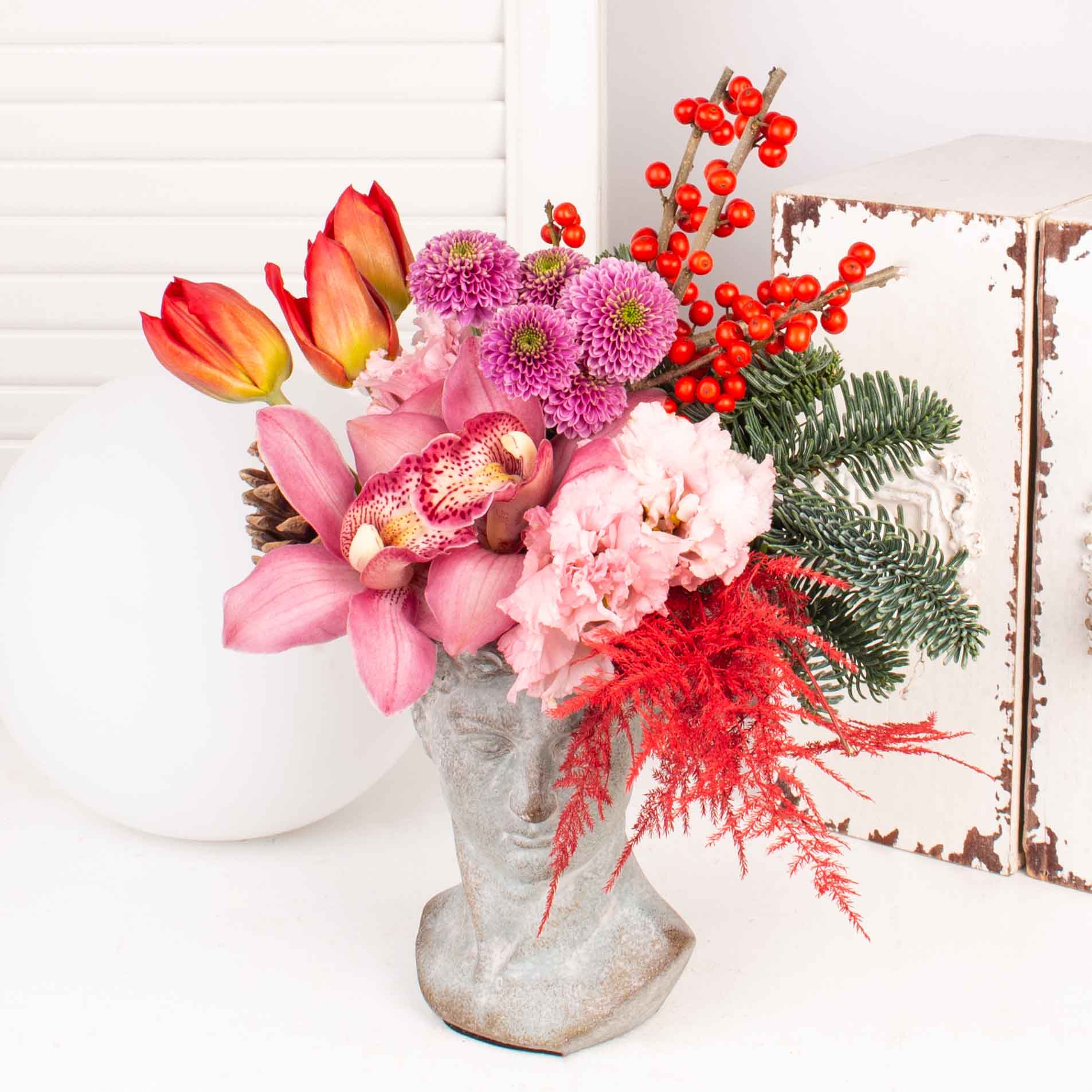Aranjament in vaza antichizata cu 2 orhidee cymbidium, lisianthus roz, ilex rosu, 3 lalele rosii, verdeata si alte flori de decor.