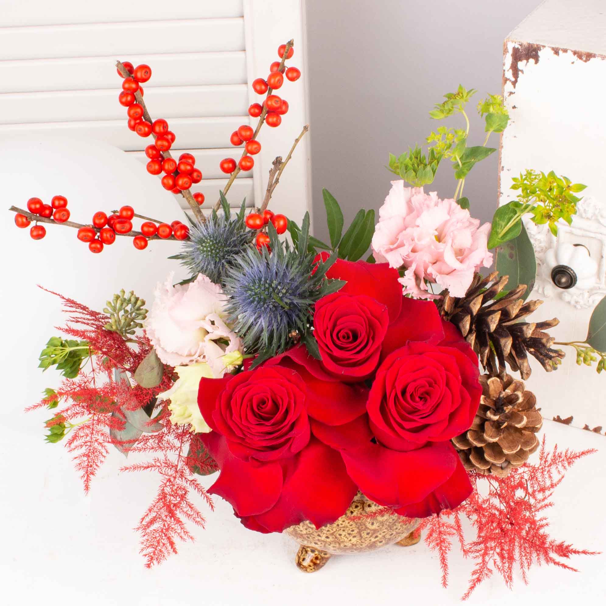 Aranjament in vas ceramic cu 3 trandafiri rosii, lisianthus roz, 2 conuri de pin, ilex, verdeata si alte flori de decor.
